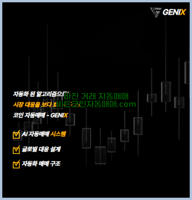 1. 암호화폐 자동매매 시스템이란 간단히 알아봅시다.코인 자동거래 또는 코인자동수익화 란 AI나 알고리즘 기반 시스템이 사용자를 대신해 암호화폐 시장을 분석하고 조건에 따라 자동으로 매수와 매도를 실행하는 거래 방식입니다. 최근 월스트리트 뿐만 아니라 전 세계적으로 AI를 활용한 코인자동거래가 이루어지고 있습니다. 감정에 의존하지 않고 24시간 시장에 대응할 수 있다는 점에서 최근 AI 코인자동거래 프로그램에 대한 관심이 빠르게 증가하고 있습니다. 2. 지닉스 자동매매 GENIX란?지닉스 자동매매 GENIX는 기존 알봇 ALBOT을 전면 리뉴얼하여 탄생한 AI 기반 코인 코인자동거래 플랫폼입니다. 지닉스 자동매매는 안정적인 수익을 내는 것을 목표로 하고 있으며, 현재 글로벌 코인 코인자동거래 솔루션으로 운영중입니다. 단순 반복 매매가 아닌 시장 흐름과 변동성에 대응하는 지능형 코인자동거래 시스템을 지향합니다. 3. 지닉스 자동매매의 주요 특징 5가지