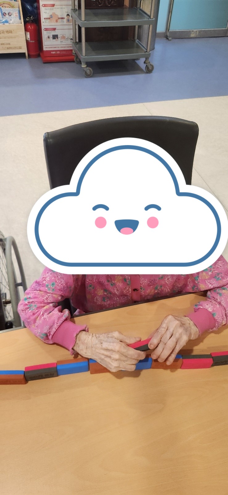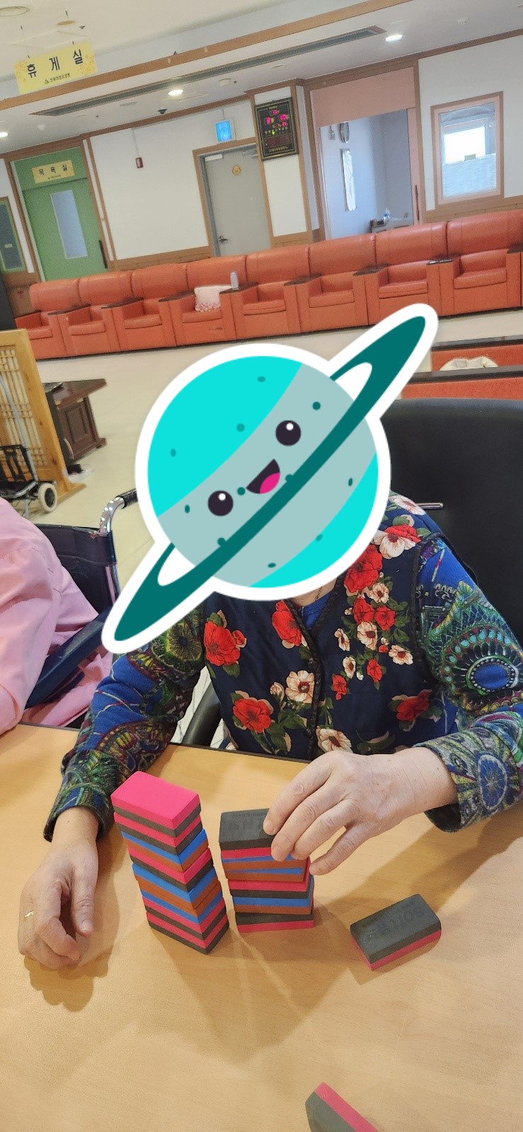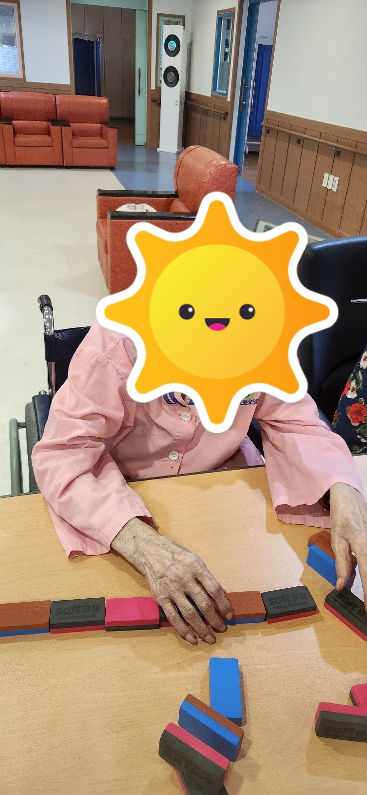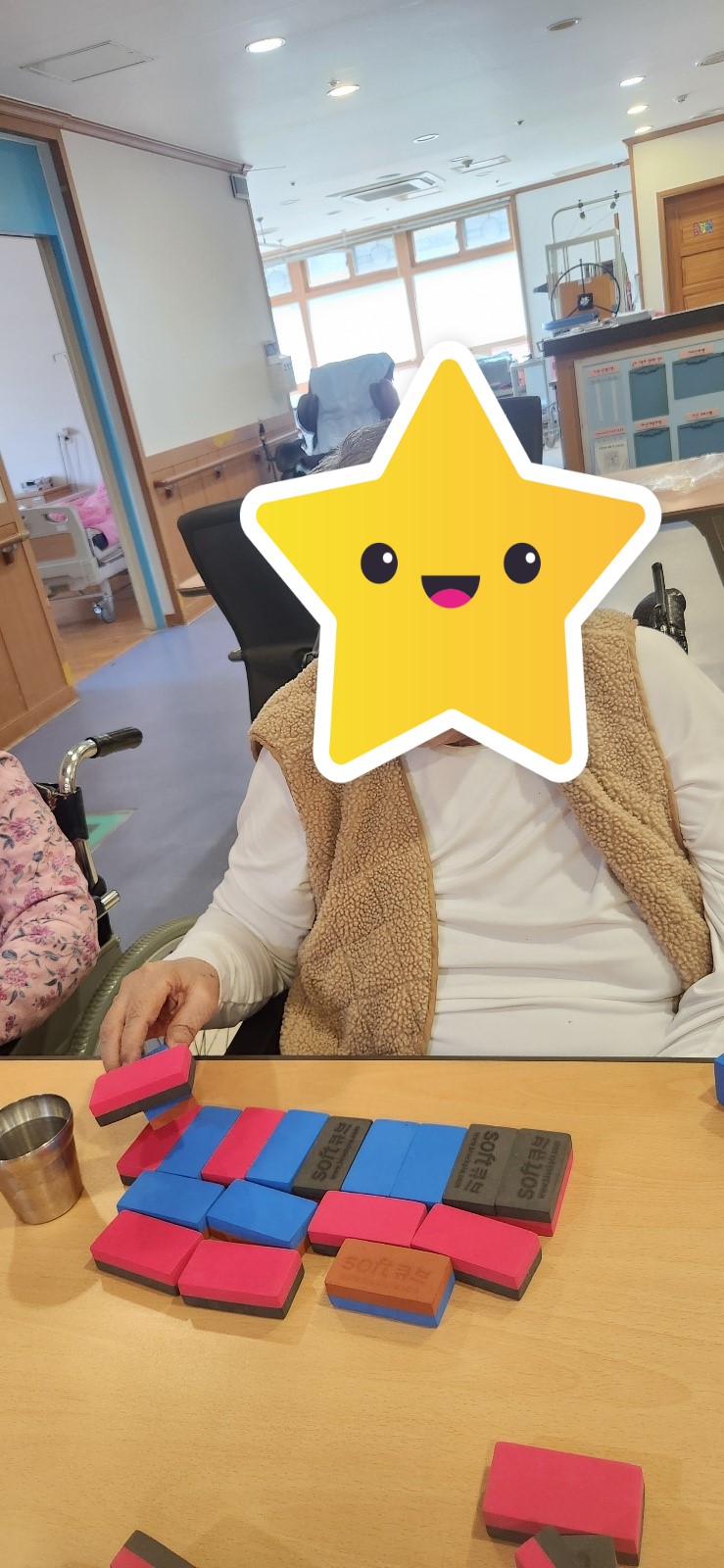 장소 : 요양원 2층 프로그램실 ★ 인원 : 어르신 18명 참석 ★ 내용 : 인지 활동 프로그램 활동 맞춤형 프로그램 강사님이 오셔서 어르신들과 함께 인지 활동프로그램을 진행하였습니다. 간단한 시니어 스트레칭과 음악체조를 한 다음 소프트 큐브를 이용해 도미노 게임도 해보고 블럭쌓기 하듯이 하나하나 엇갈리게 누가누가 높이 쌓나 게임도 해보고 소프트 큐브로 벽을 만들어 그 안에서 공 놀이 게임도 해보았습니다.