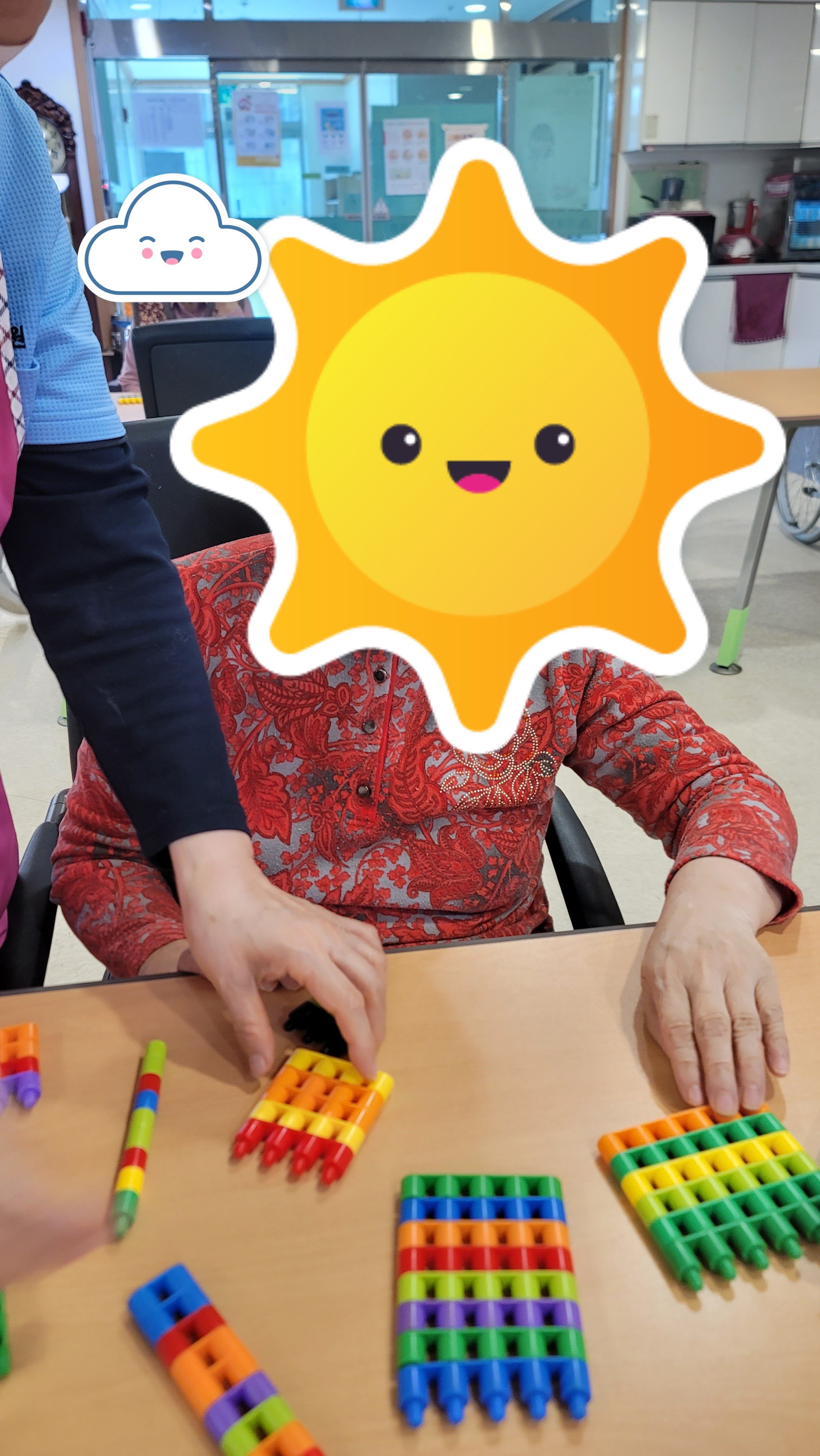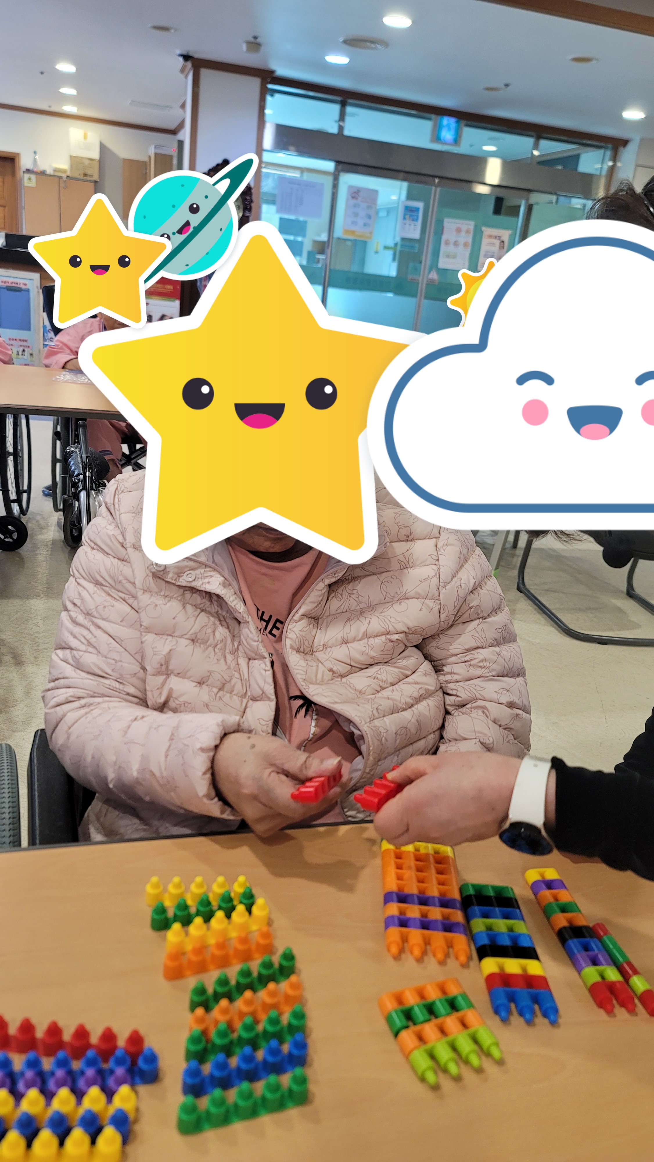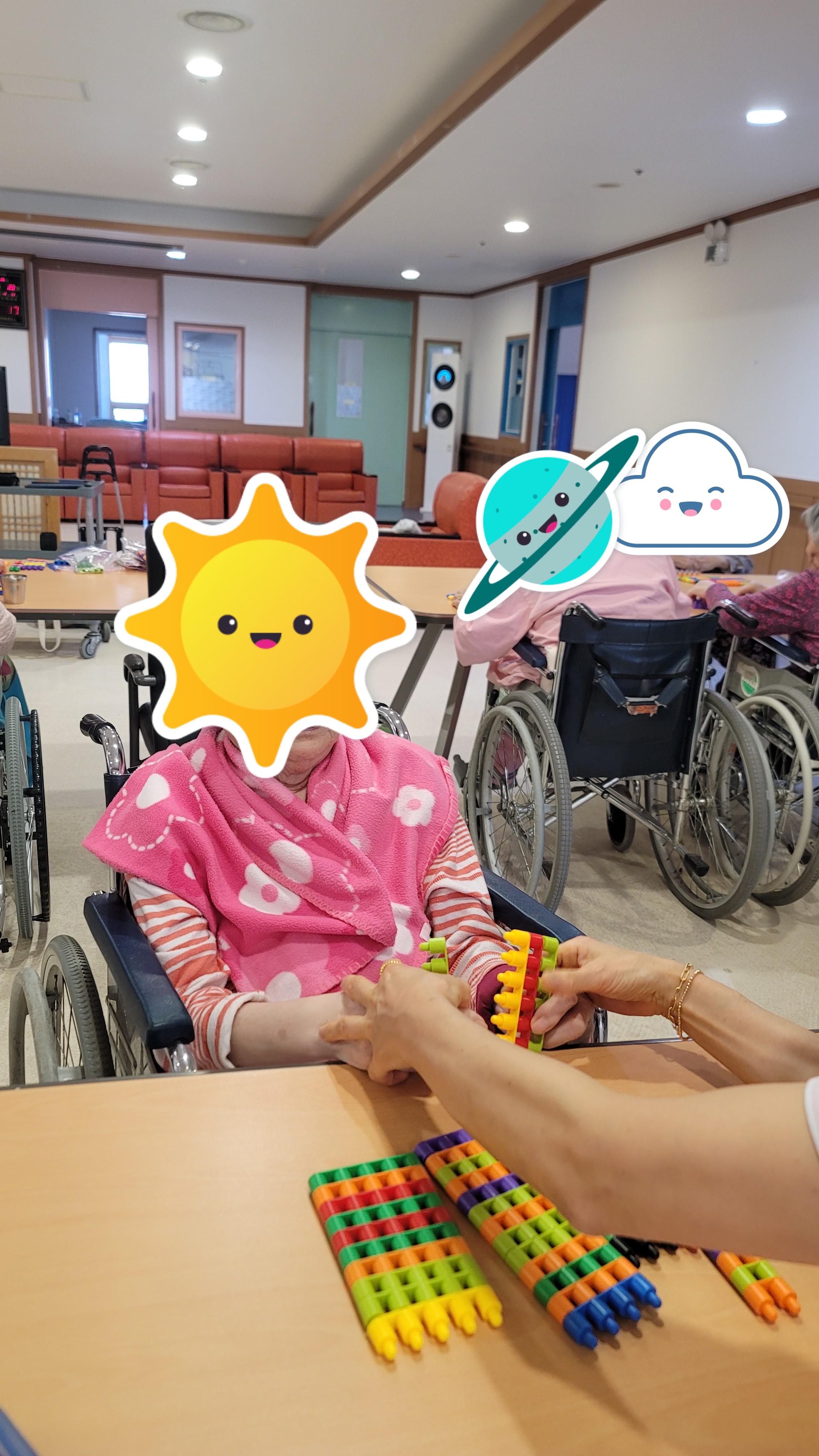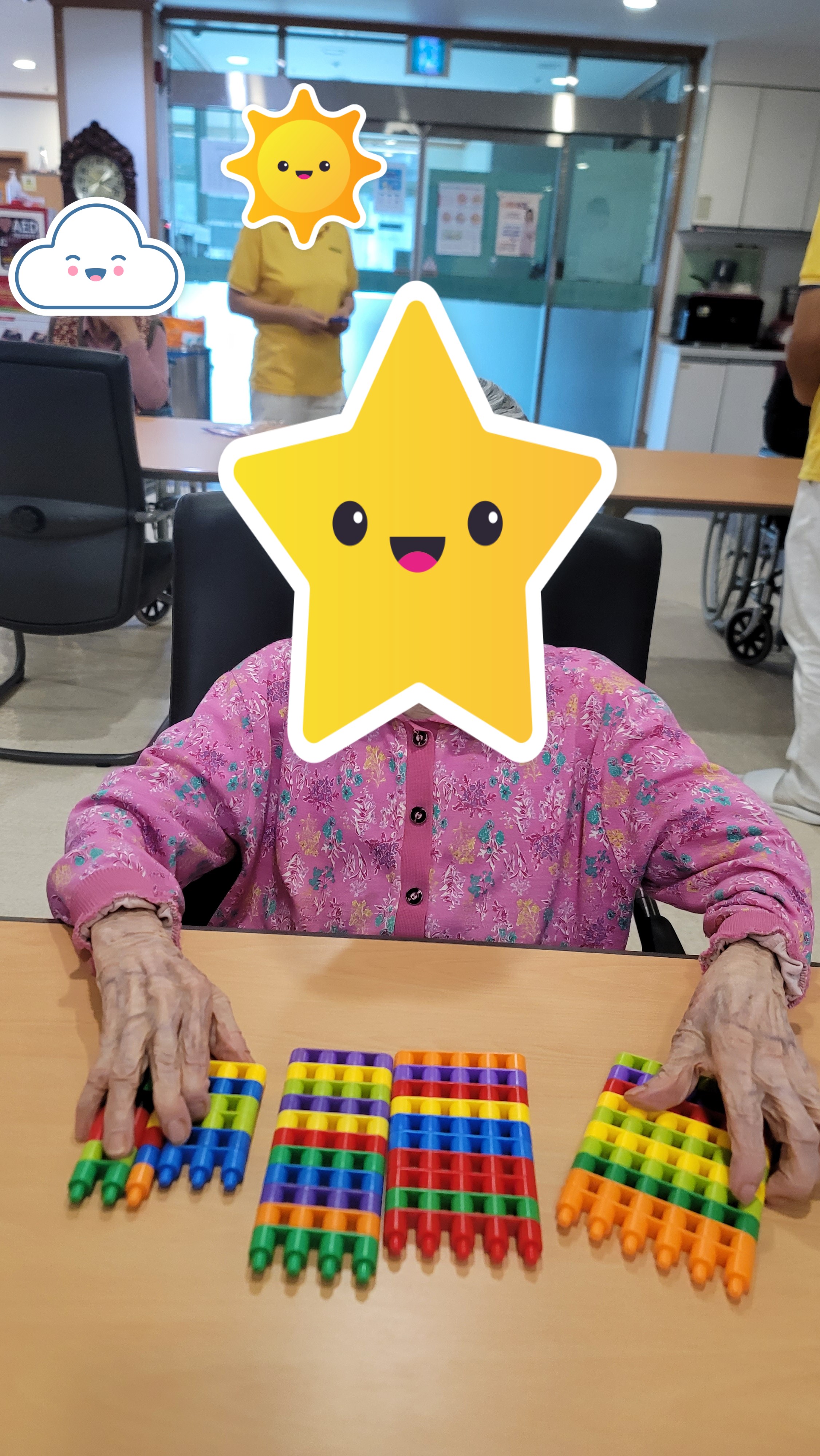 장소 : 요양원 2층 프로그램실 ★ 인원 : 어르신 18명 참석 ★ 내용 : 인지 활동 프로그램 활동 맞춤형 프로그램 강사님이 오셔서 어르신들과 함께 인지 활동프로그램을 진행하였습니다. 간단한 시니어 스트레칭과 음악체조를 한 다음 총알블럭을 이용하여 서로서로 연결도 해보고 다른 모양을 만들기 위해 연결했던 블럭을 다시 해체도 해보며 블럭의 이해력을 향상 시켰고 방향도 바꿔보며 블럭을 이용해 다양한 모양을 만들어 보았습니다.