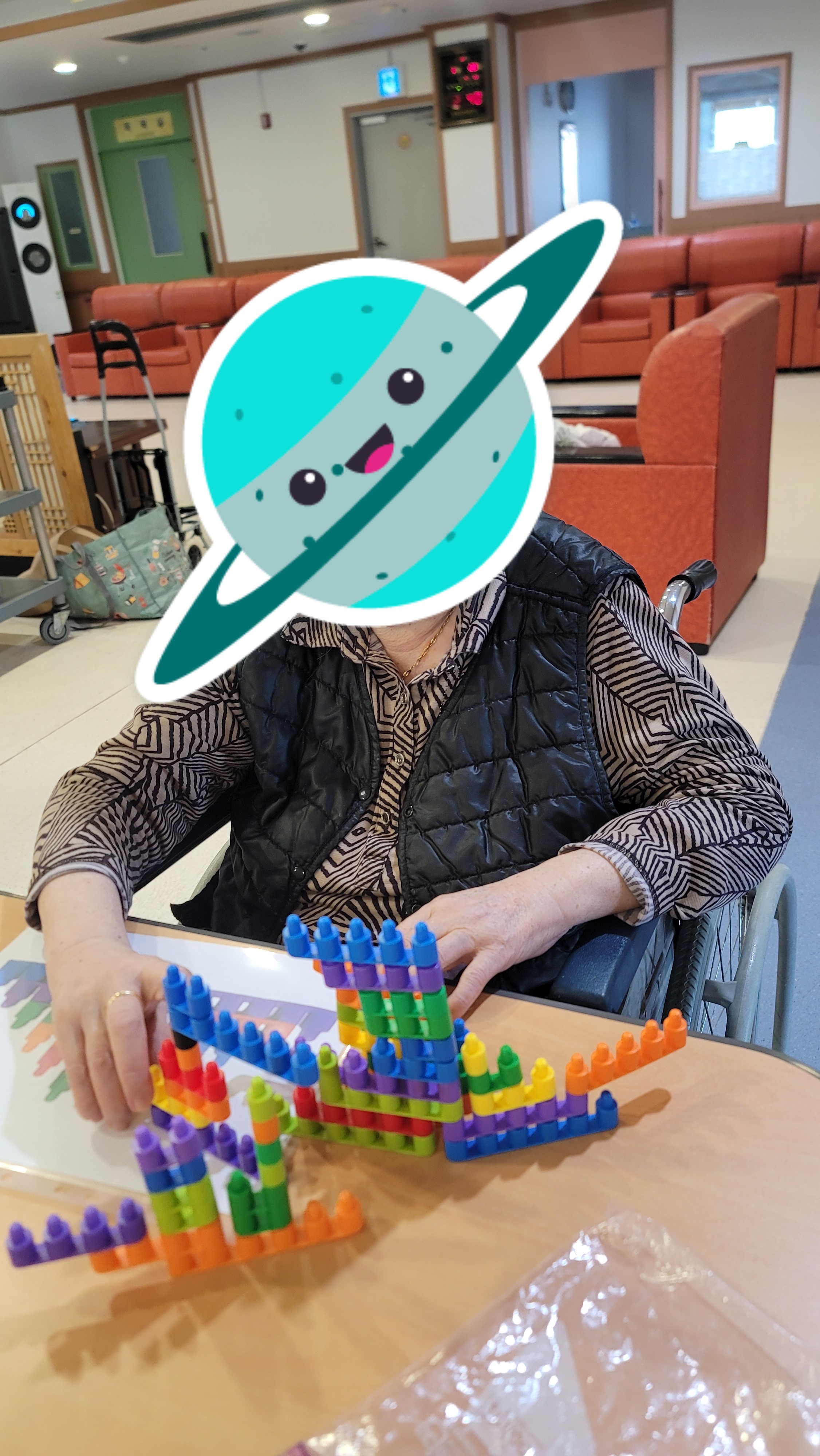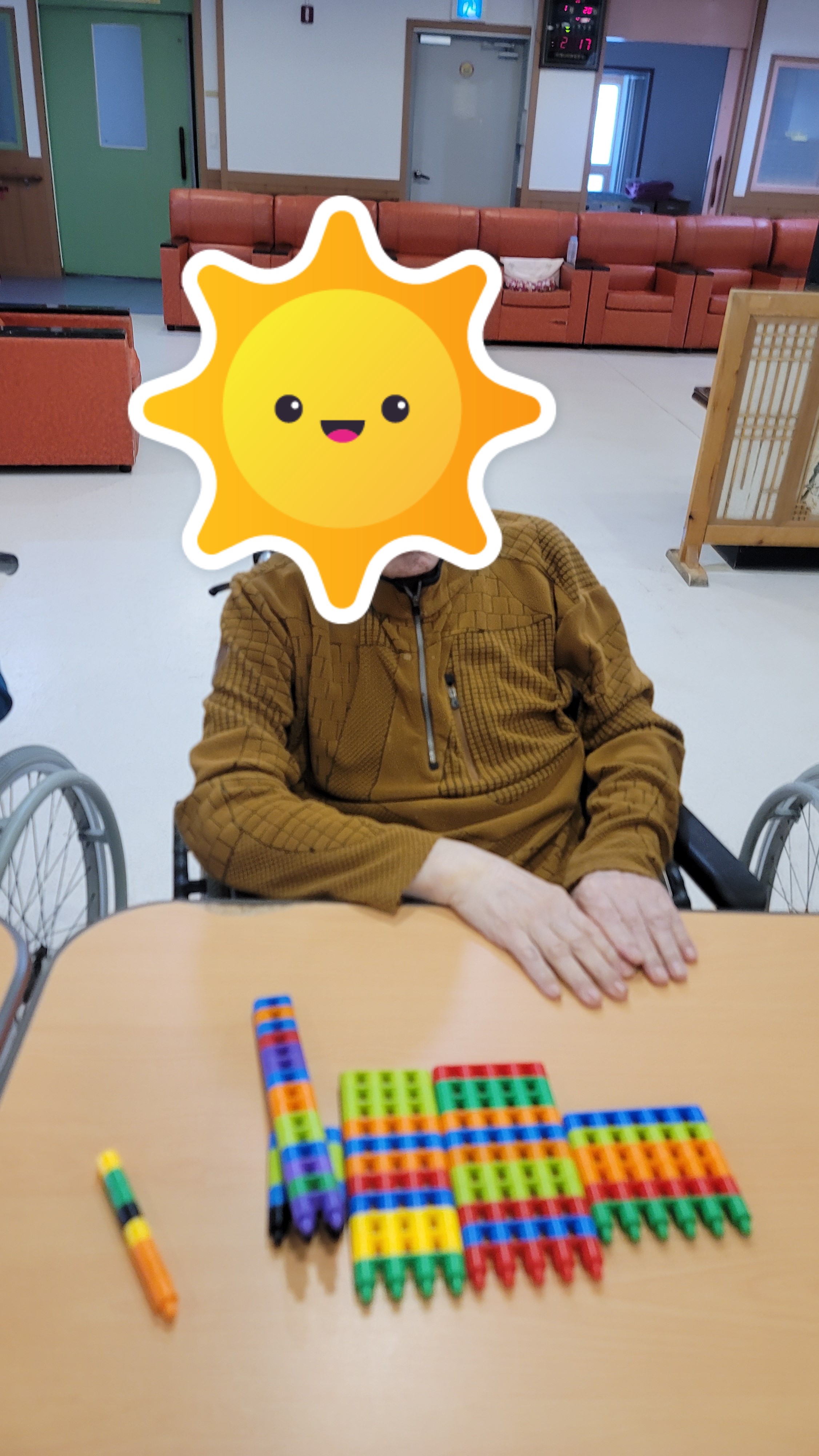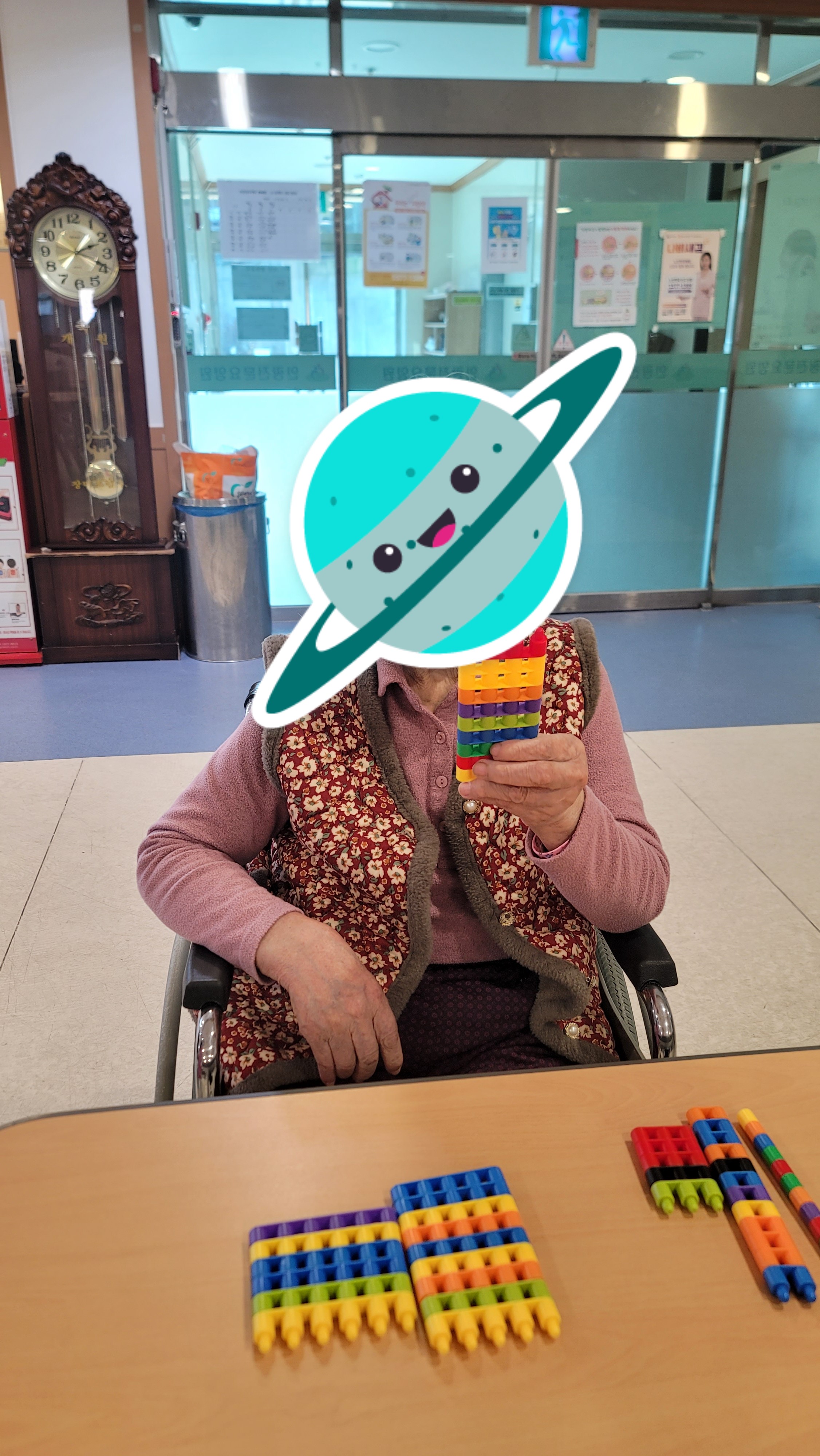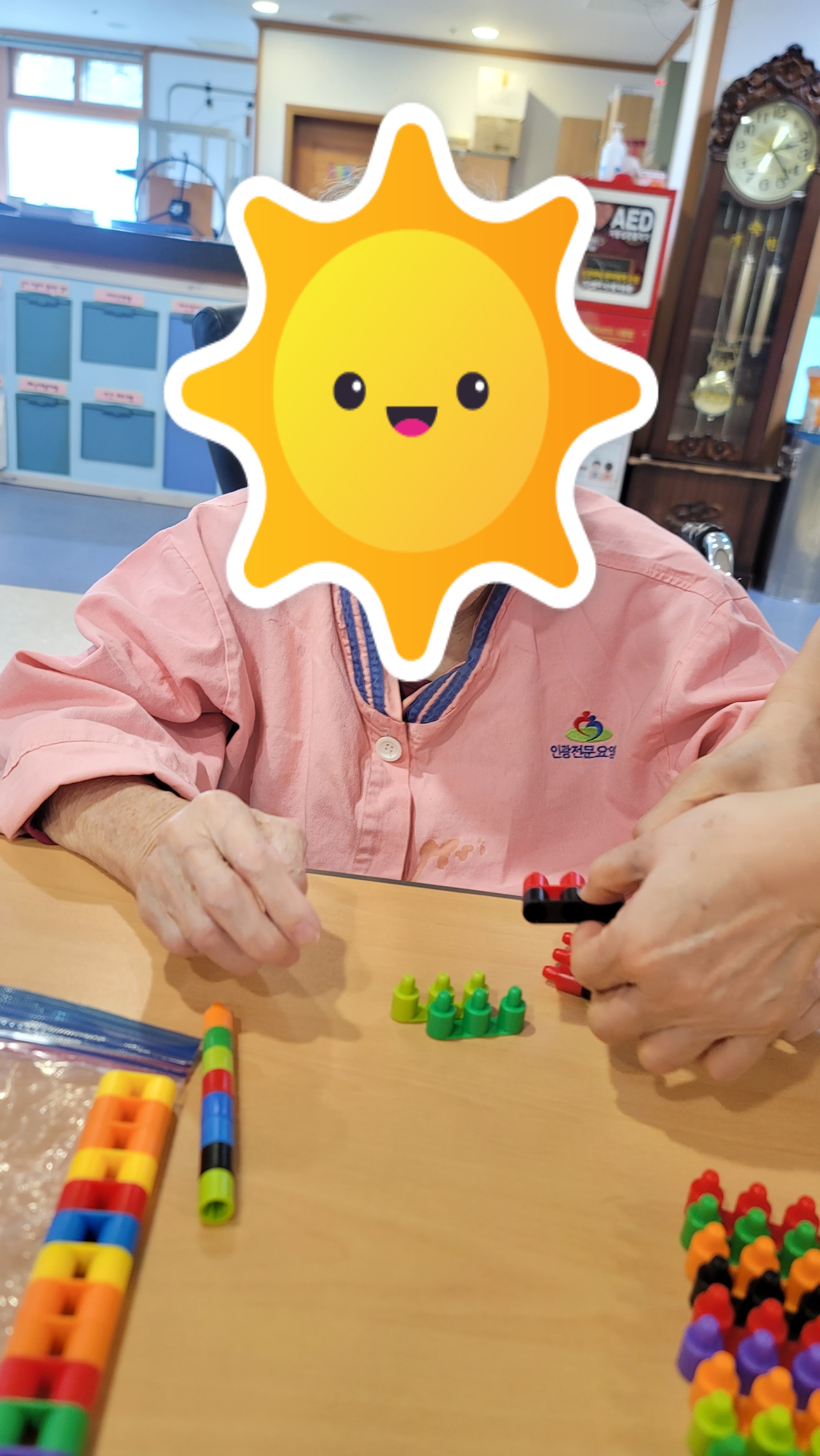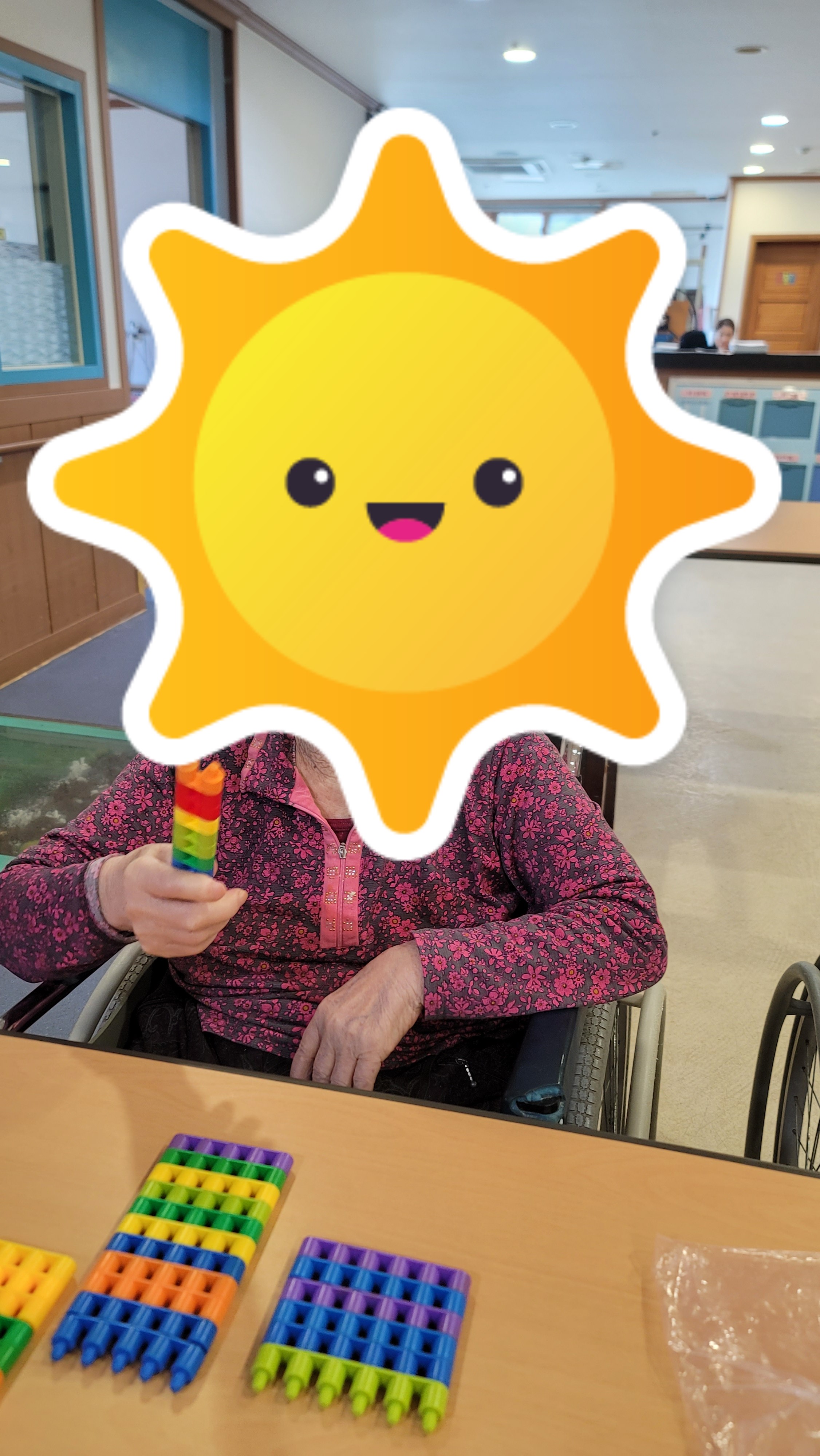 장소 : 요양원 2층 프로그램실 ★ 인원 : 어르신 18명 참석 ★ 내용 : 인지 활동 프로그램 활동 맞춤형 프로그램 강사님이 오셔서 어르신들과 함께 인지 활동프로그램을 진행하였습니다. 간단한 시니어 스트레칭과 음악체조를 한 다음 총알블럭을 이용하여 서로서로 연결도 해보고 다른 모양을 만들기 위해 연결했던 블럭을 다시 해체도 해보며 블럭의 이해력을 향상 시켰고 방향도 바꿔보며 블럭을 이용해 다양한 모양을 만들어 보았습니다.