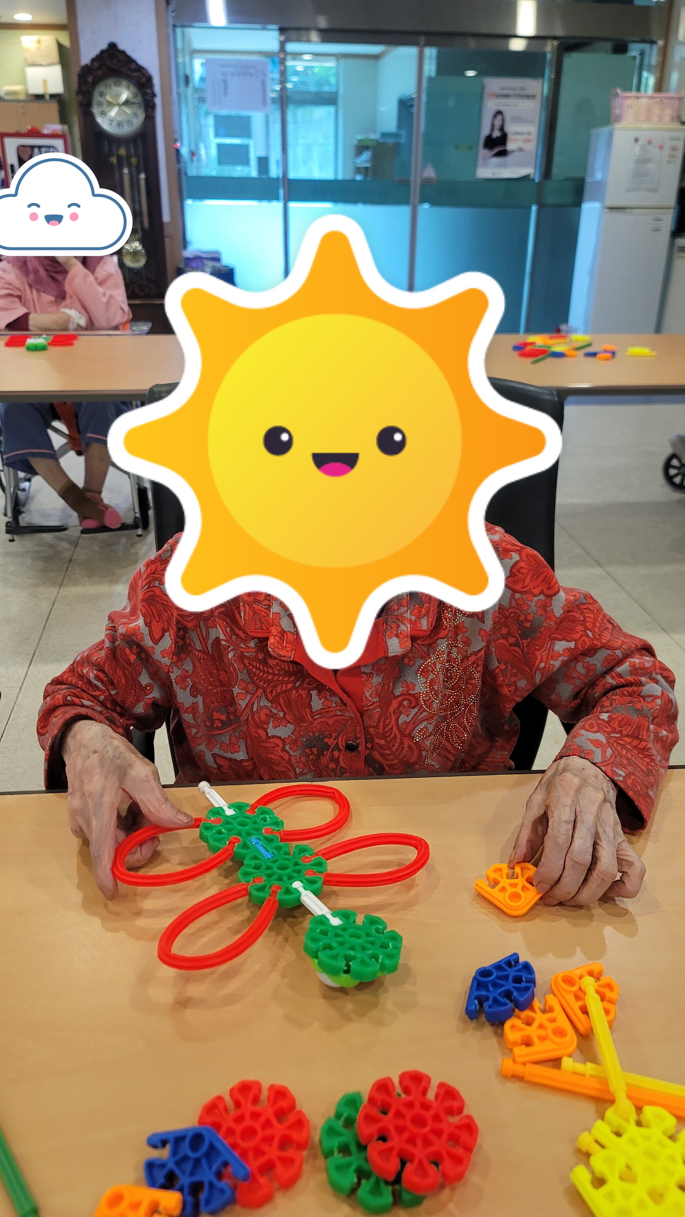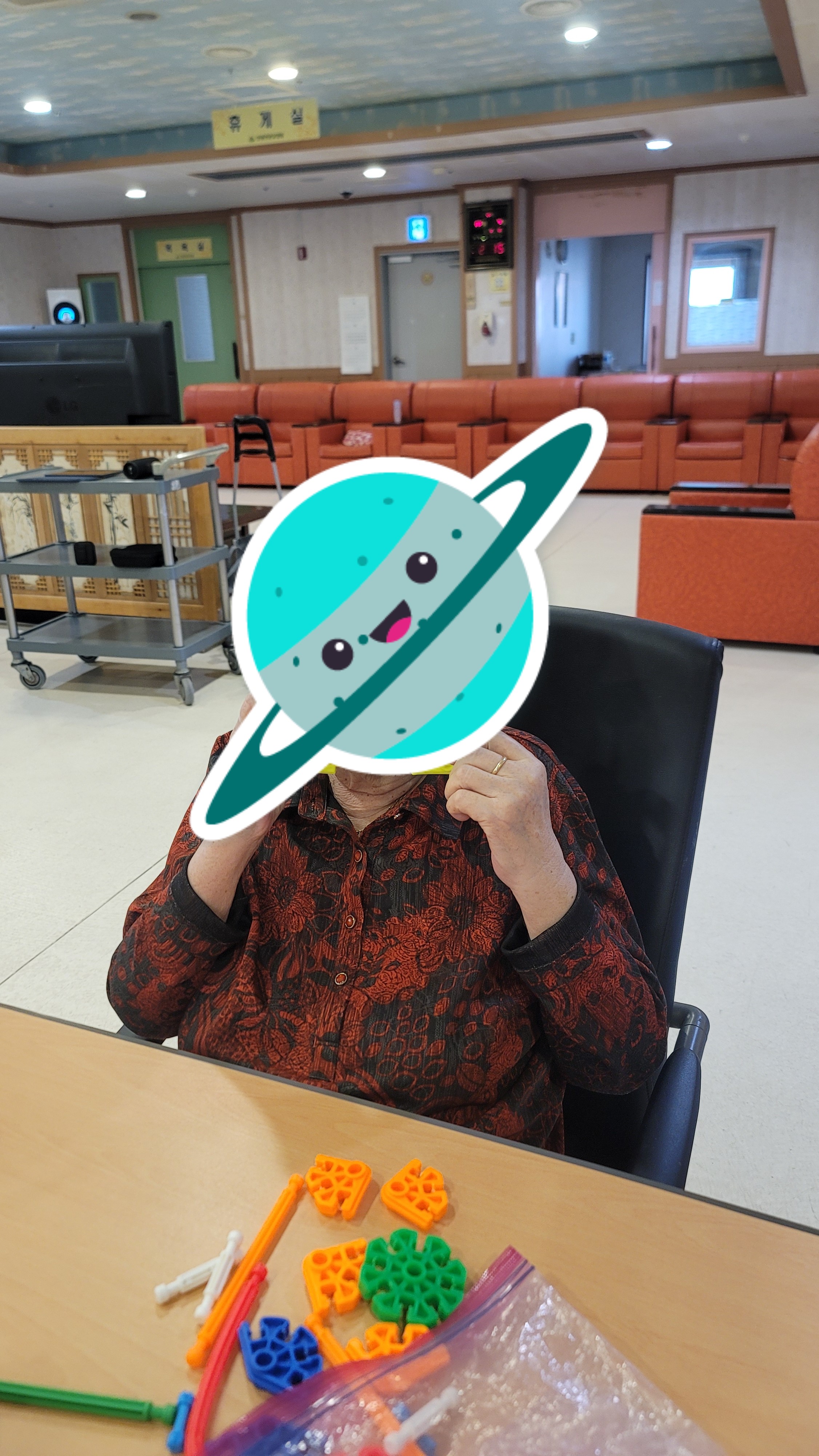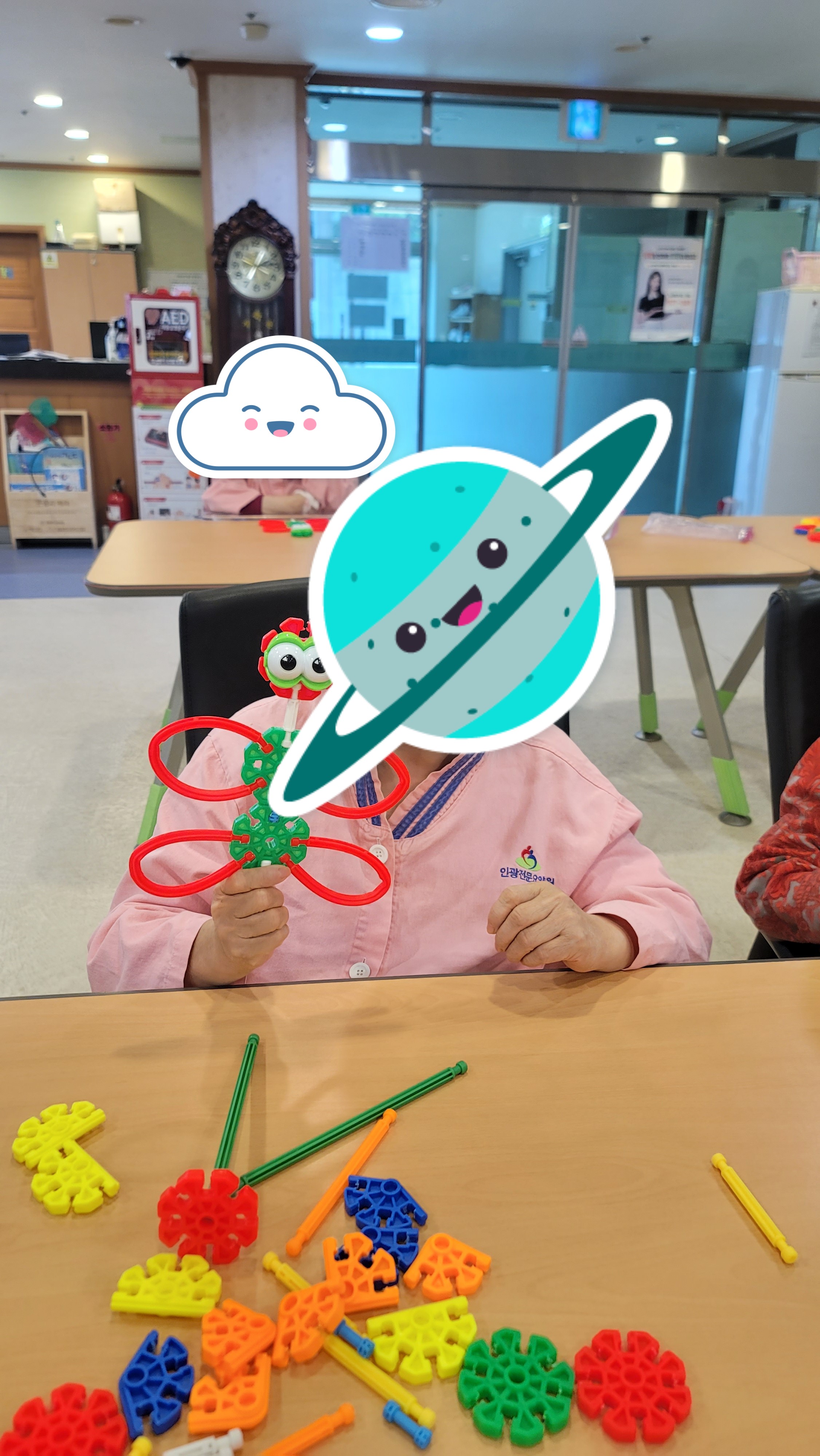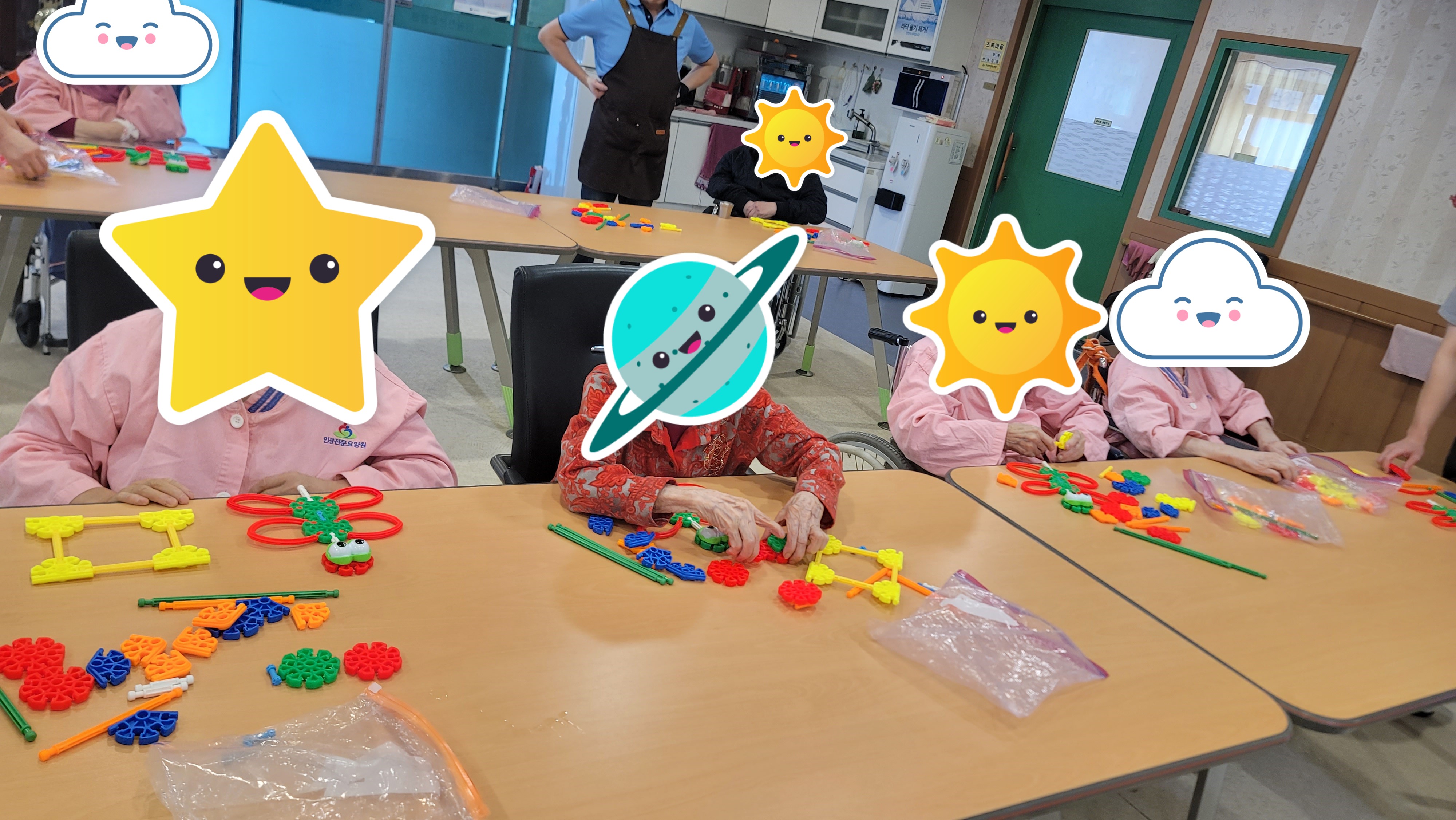 간단한 시니어 스트레칭과 음악체조를 한 다음 휘어지는 블럭을 이용해 꽃 하고 나비도 만들어 보고 눈도 달아주고 코도 달아주니 꼭 사람 같다고 어르신들 모두 한결 같이 같은 대답을 하셨으며, 다음에는 더 다양한 모양의 블럭을 이용하여 다방면의 모형을 만들어보자고 이야기 하셨습니다.