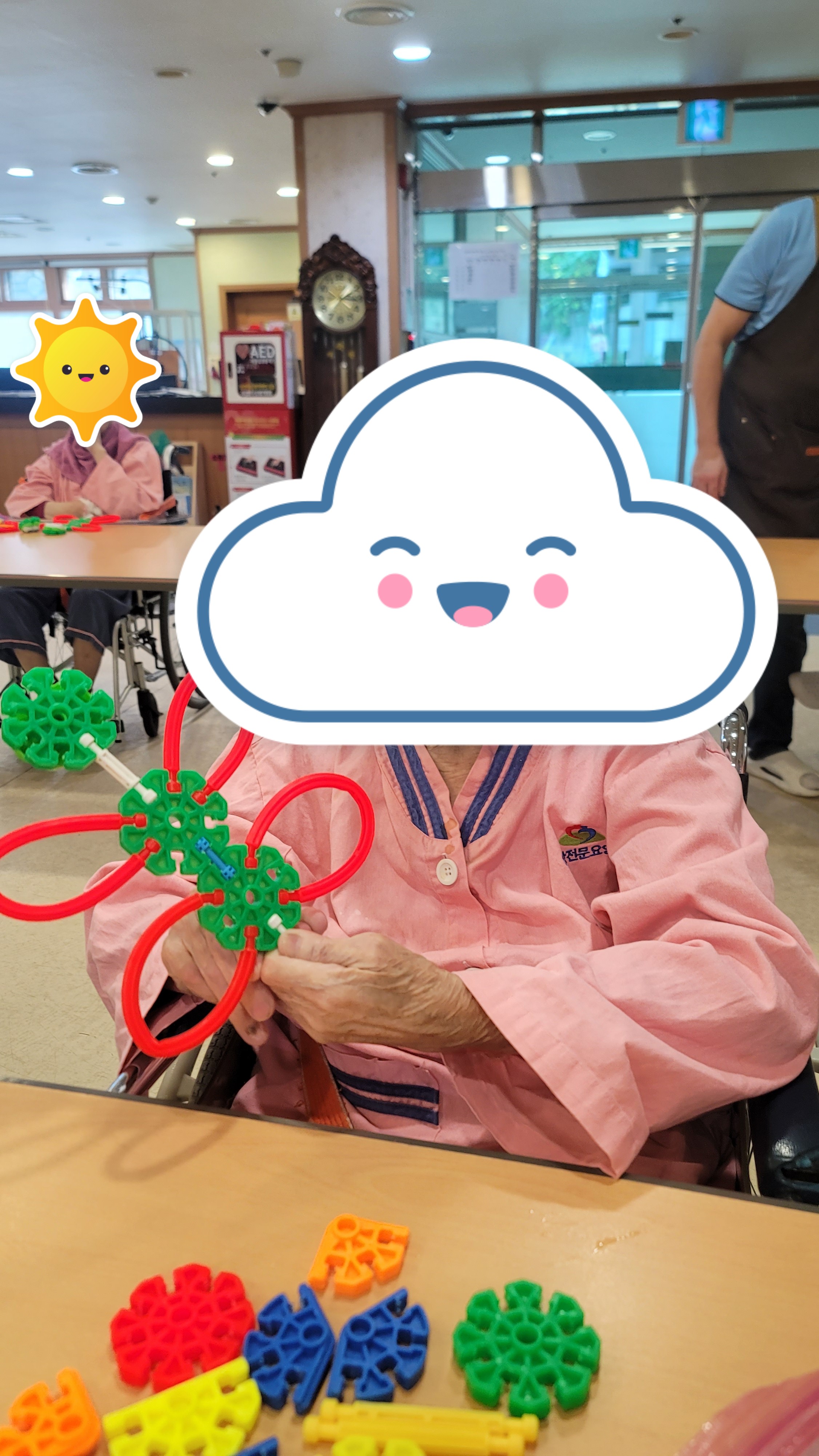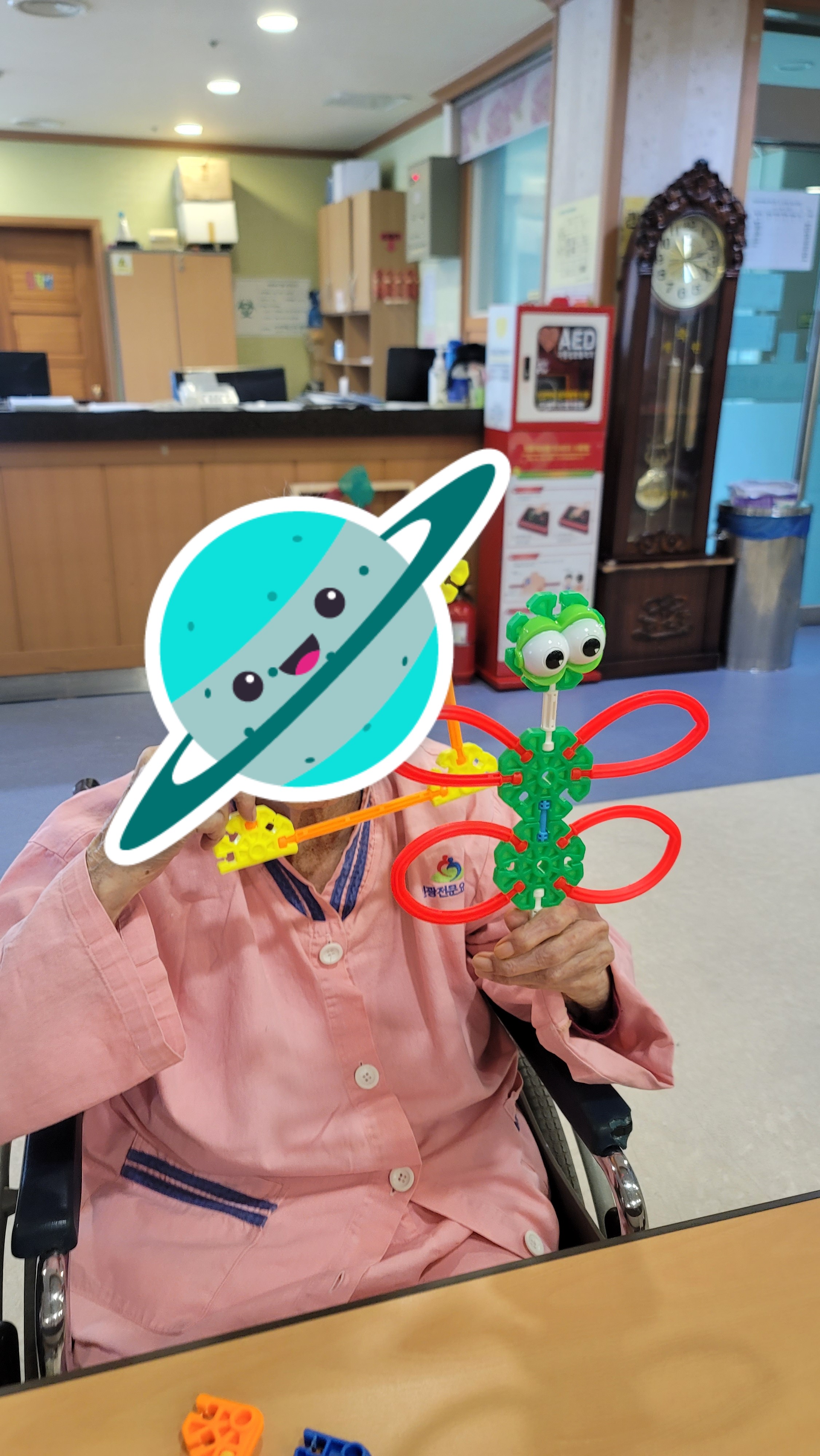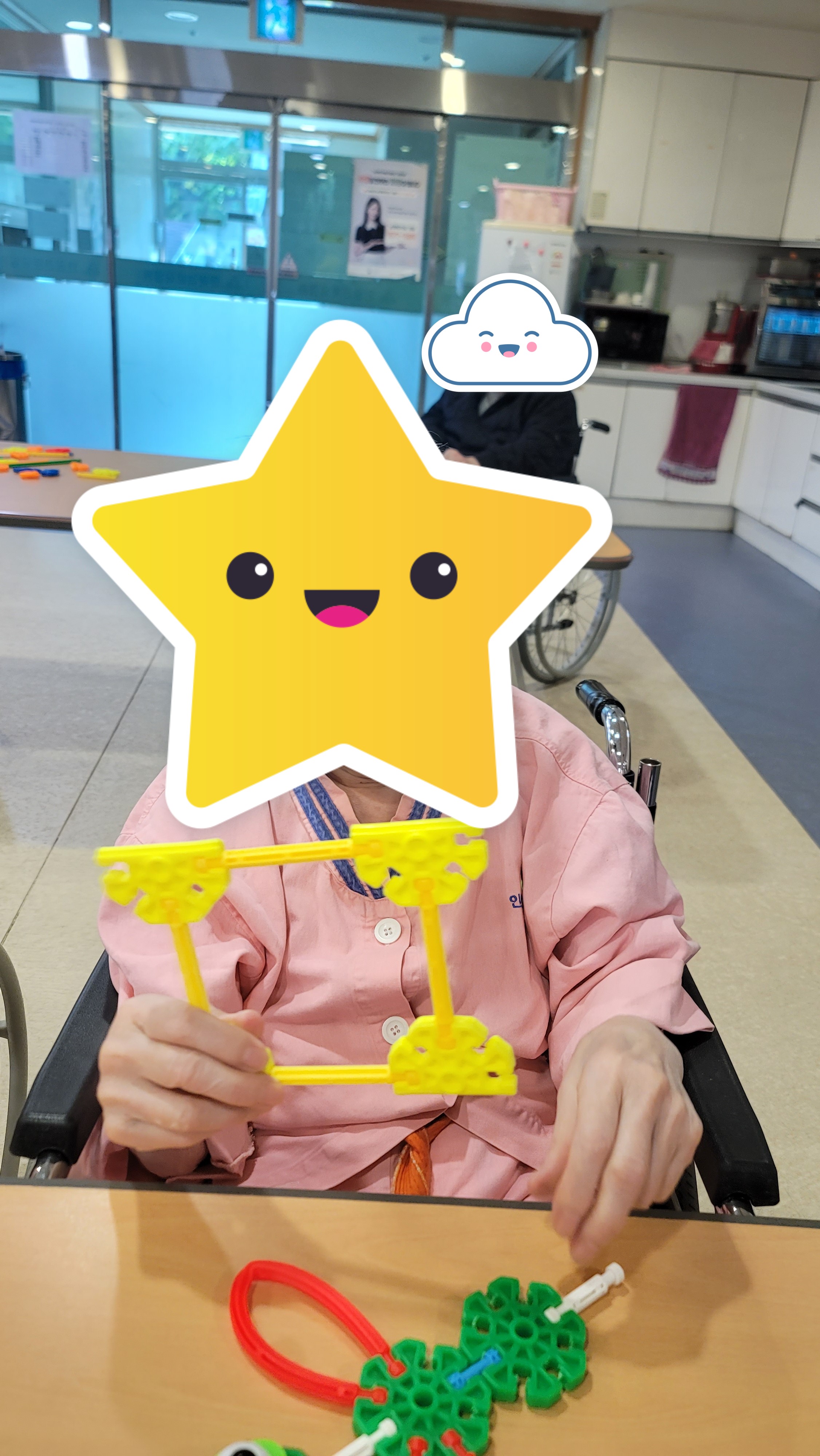 간단한 시니어 스트레칭과 음악체조를 한 다음 휘어지는 블럭을 이용해 꽃 하고 나비도 만들어 보고 눈도 달아주고 코도 달아주니 꼭 사람 같다고 어르신들 모두 한결 같이 같은 대답을 하셨으며, 다음에는 더 다양한 모양의 블럭을 이용하여 다방면의 모형을 만들어보자고 이야기 하셨습니다.