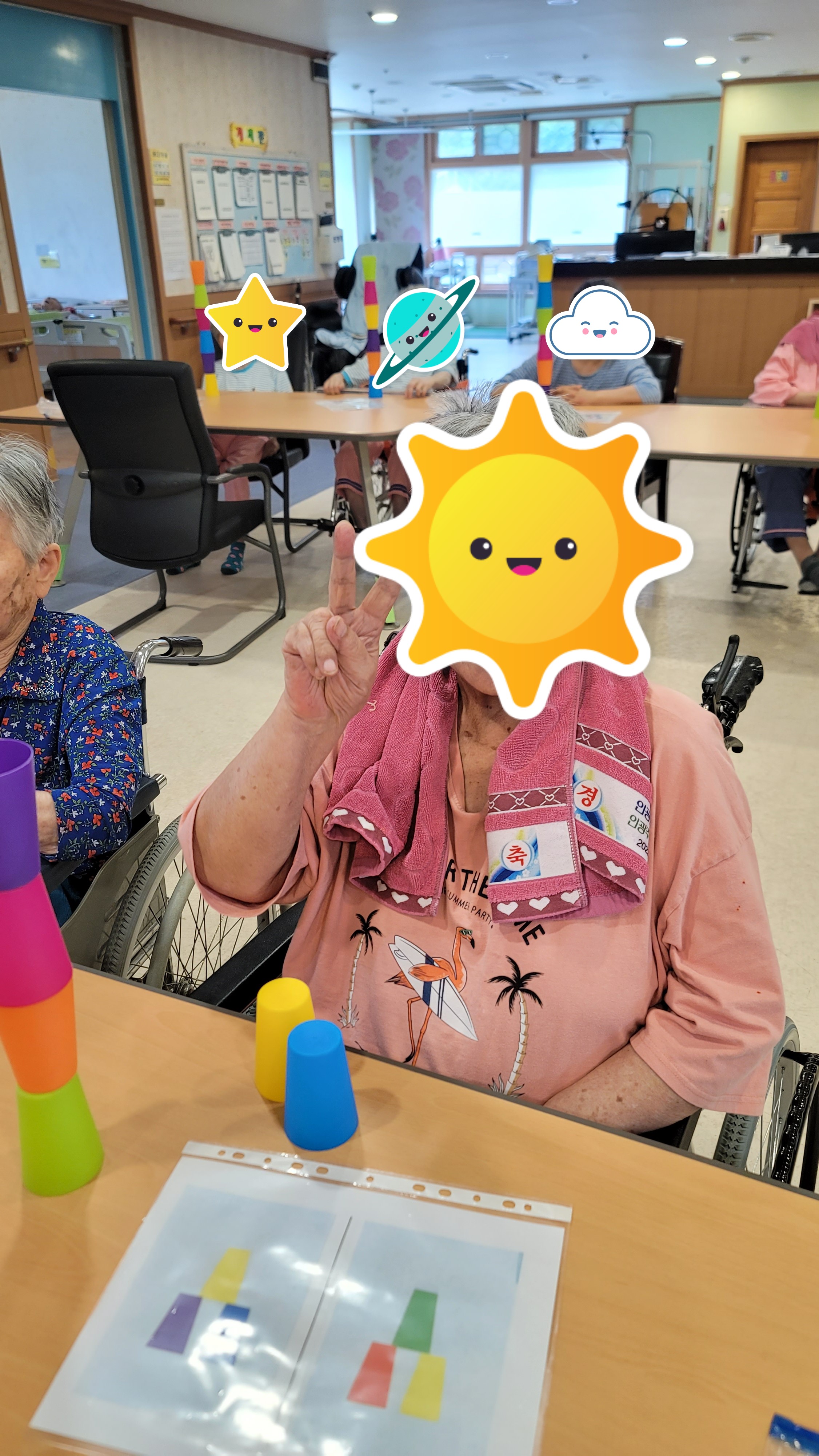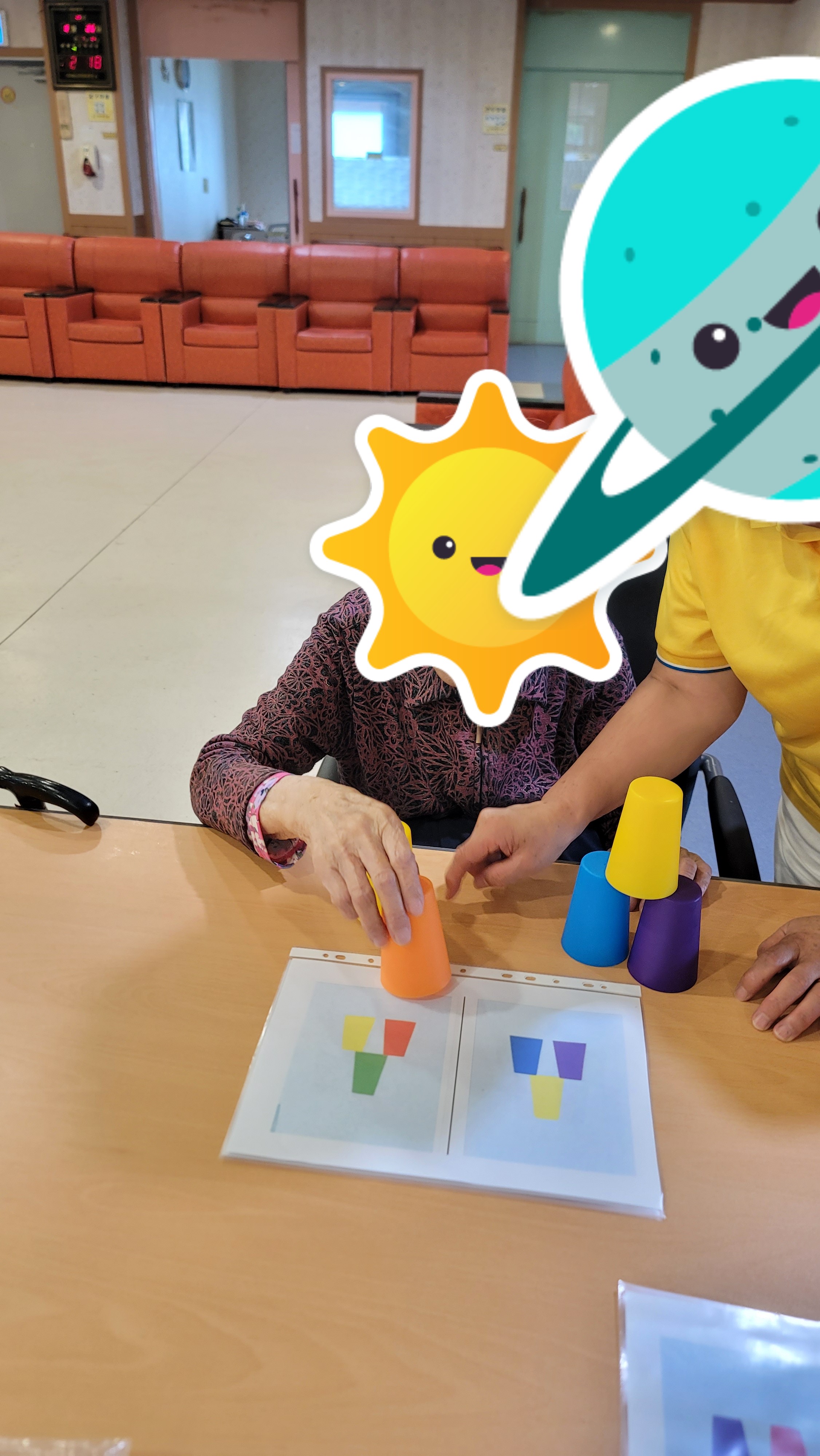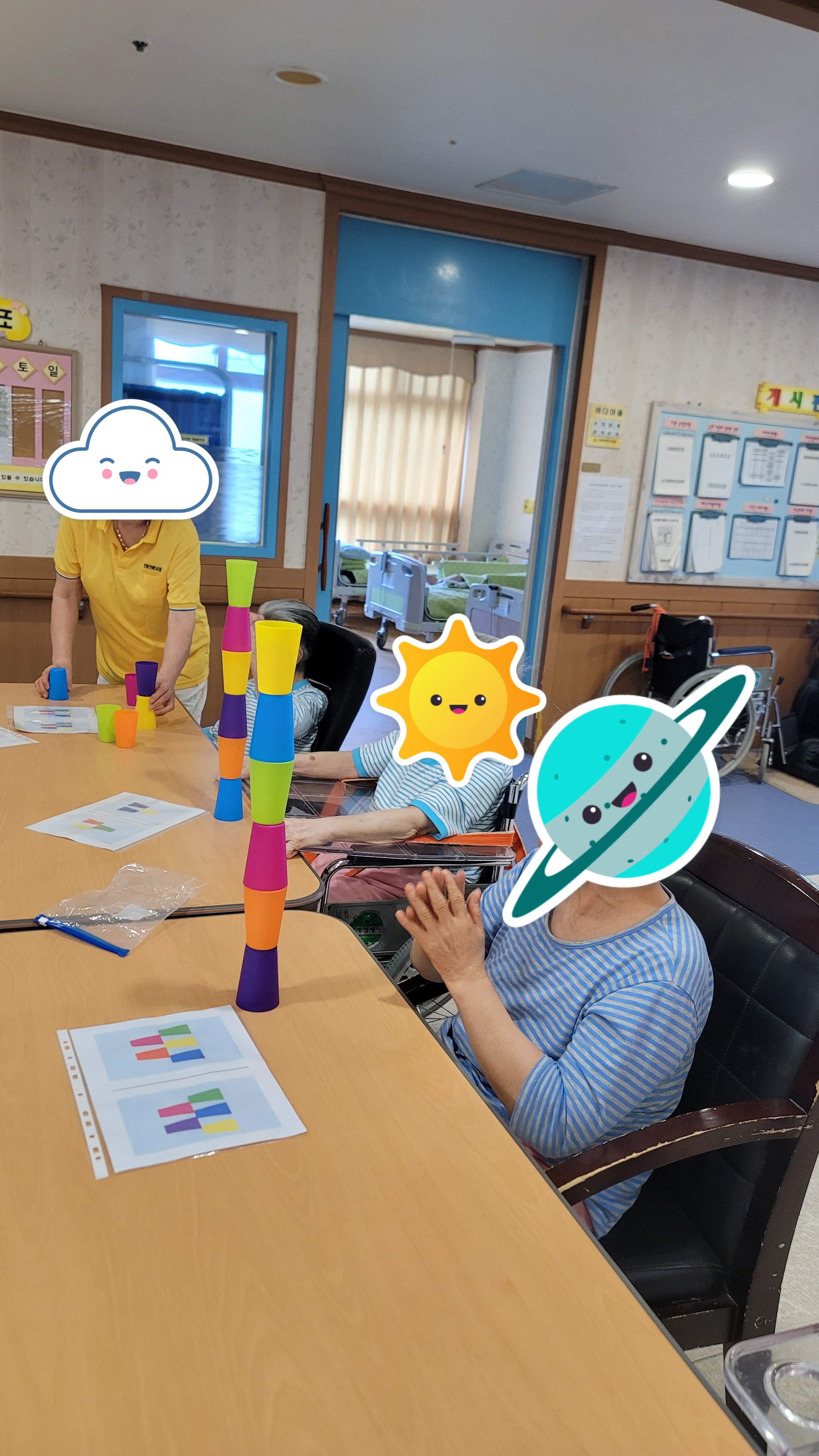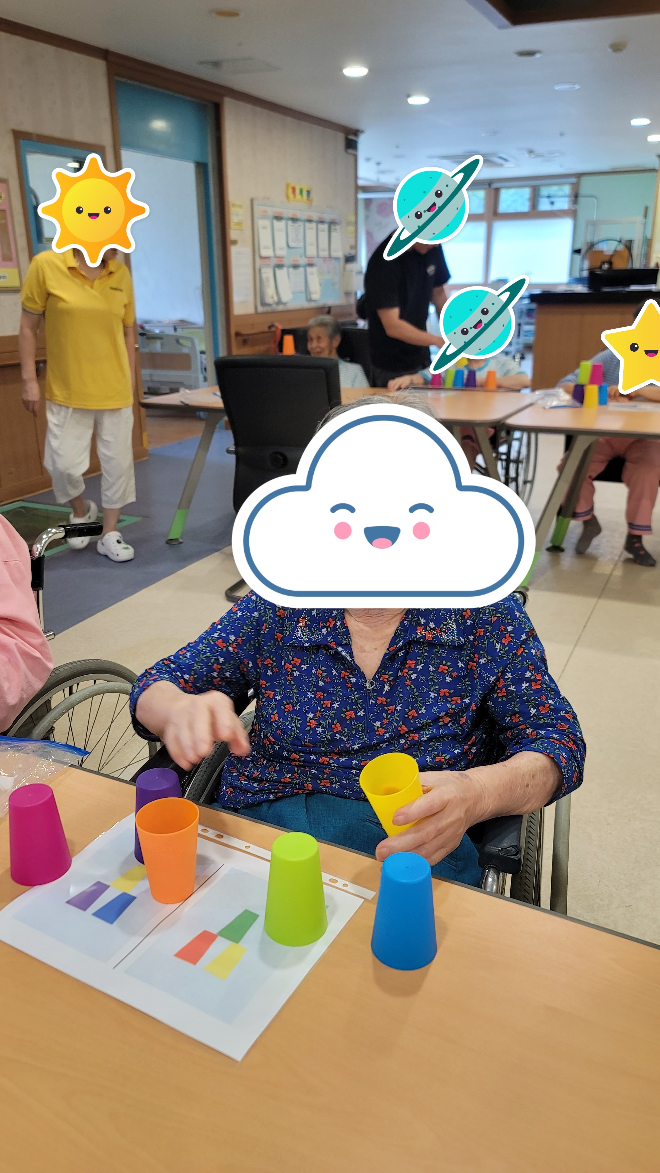 간단한 시니어 스트레칭과 건강박수로 활기를 북돋은 다음, 형형색색의 플라스틱 컵을 이용해 컵쌓기 프로그램을 해보았습니다. 다양한 색의 컵을 활동지에 나와있는 모양 그대로 하나 하나 쌓아서 모양을 완성해보니 아무 도움 없이 스스로 해냈다는 큰 기쁨에 시간 가는 줄 몰랐습니다.