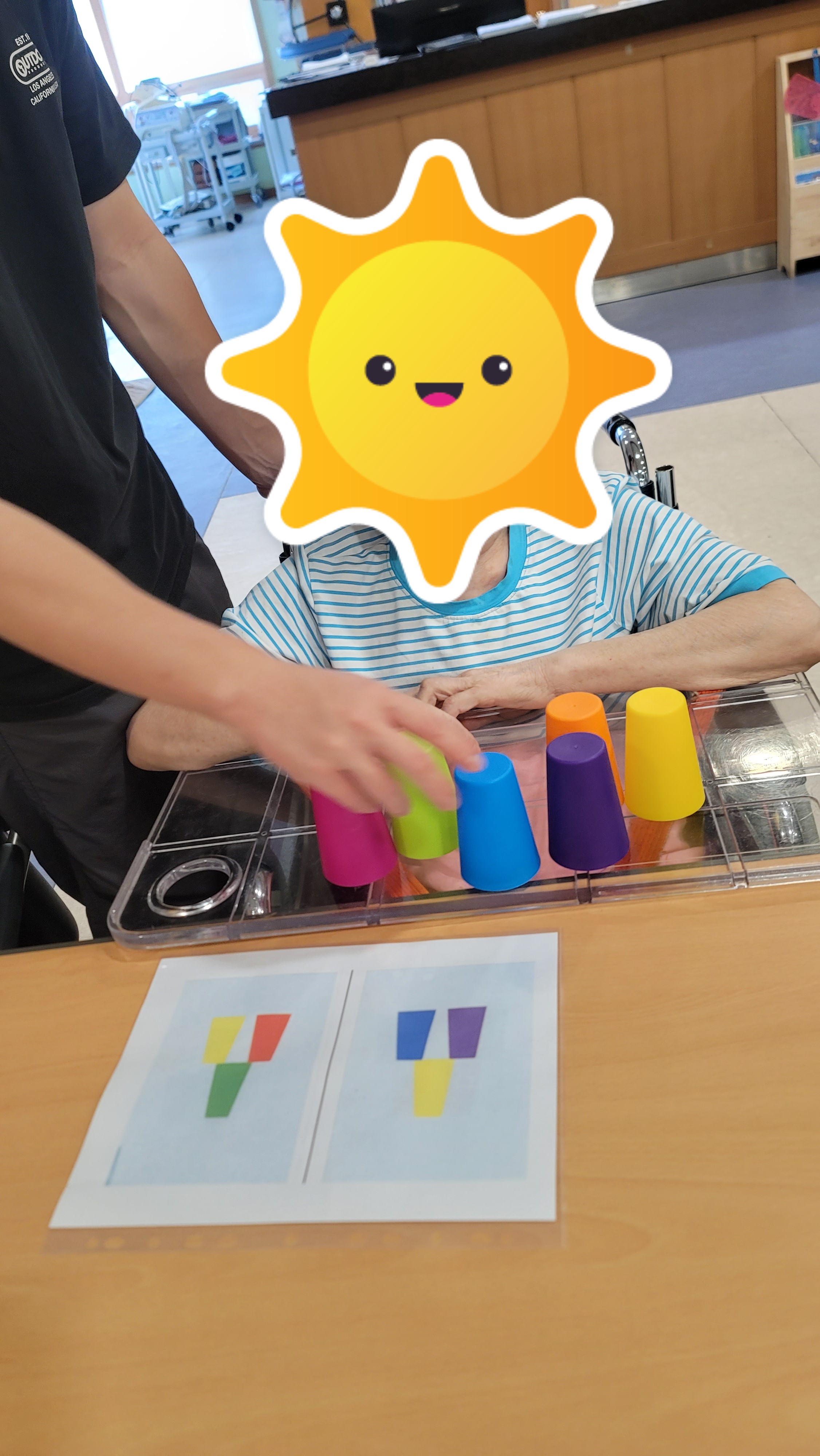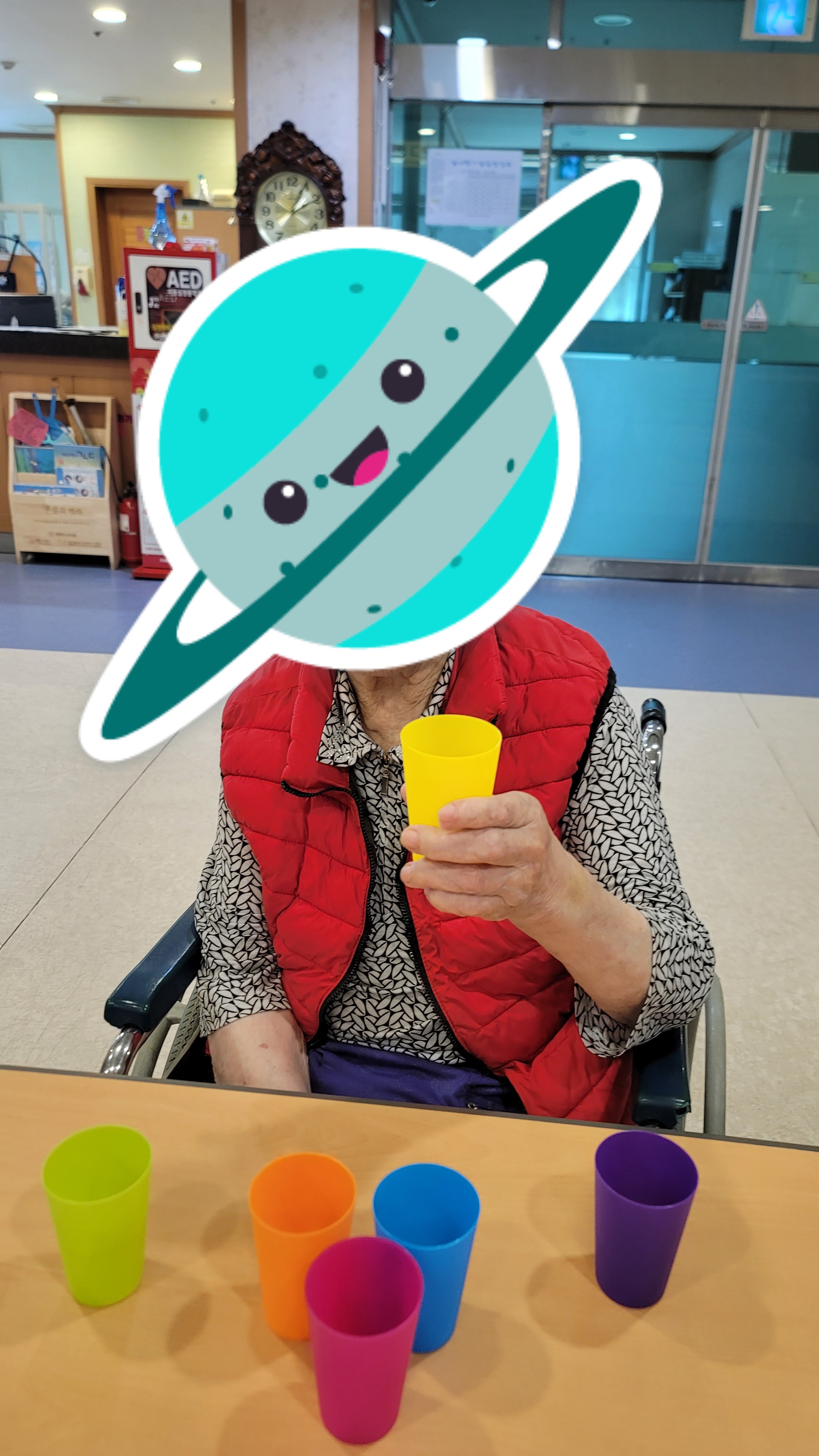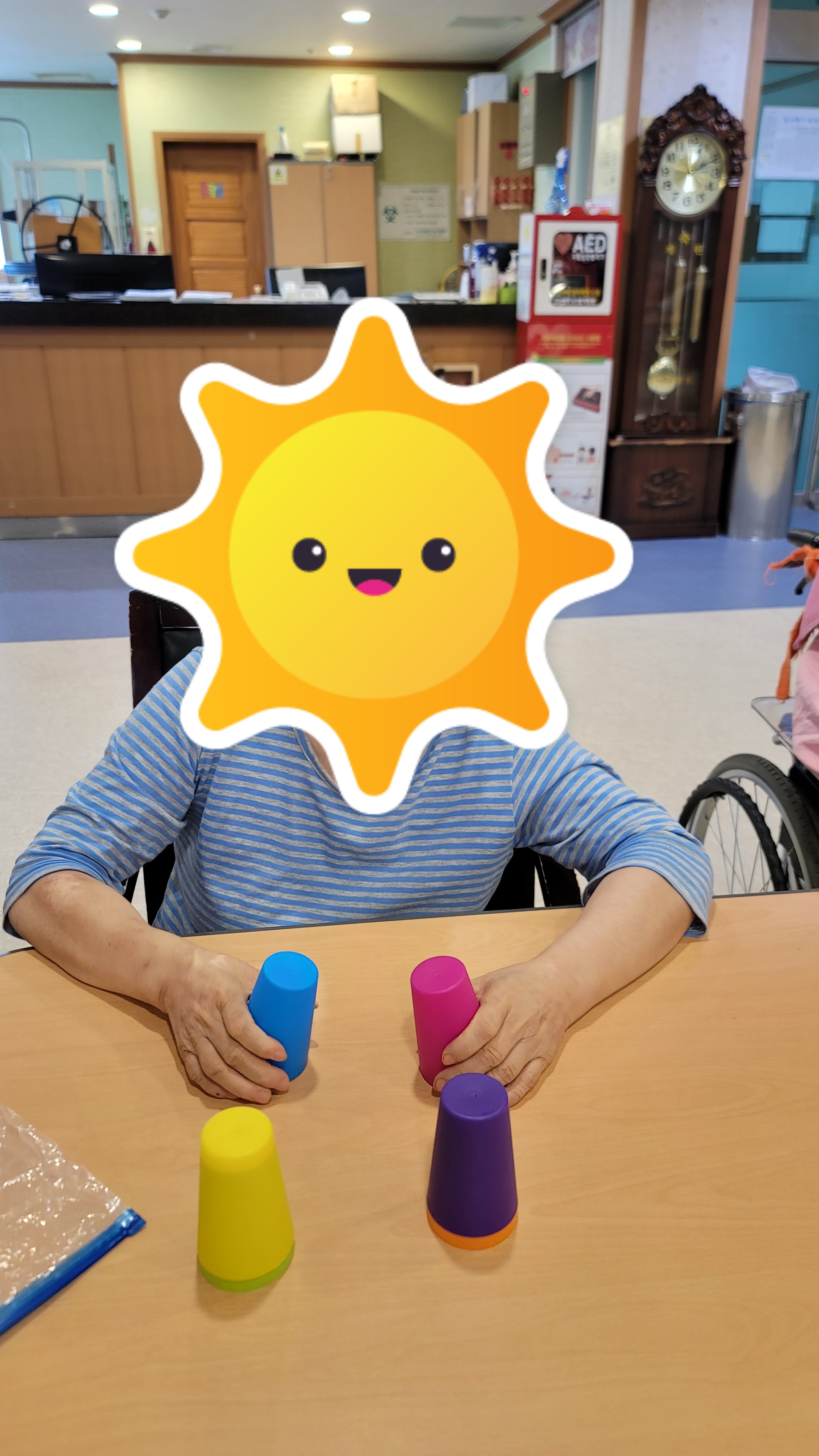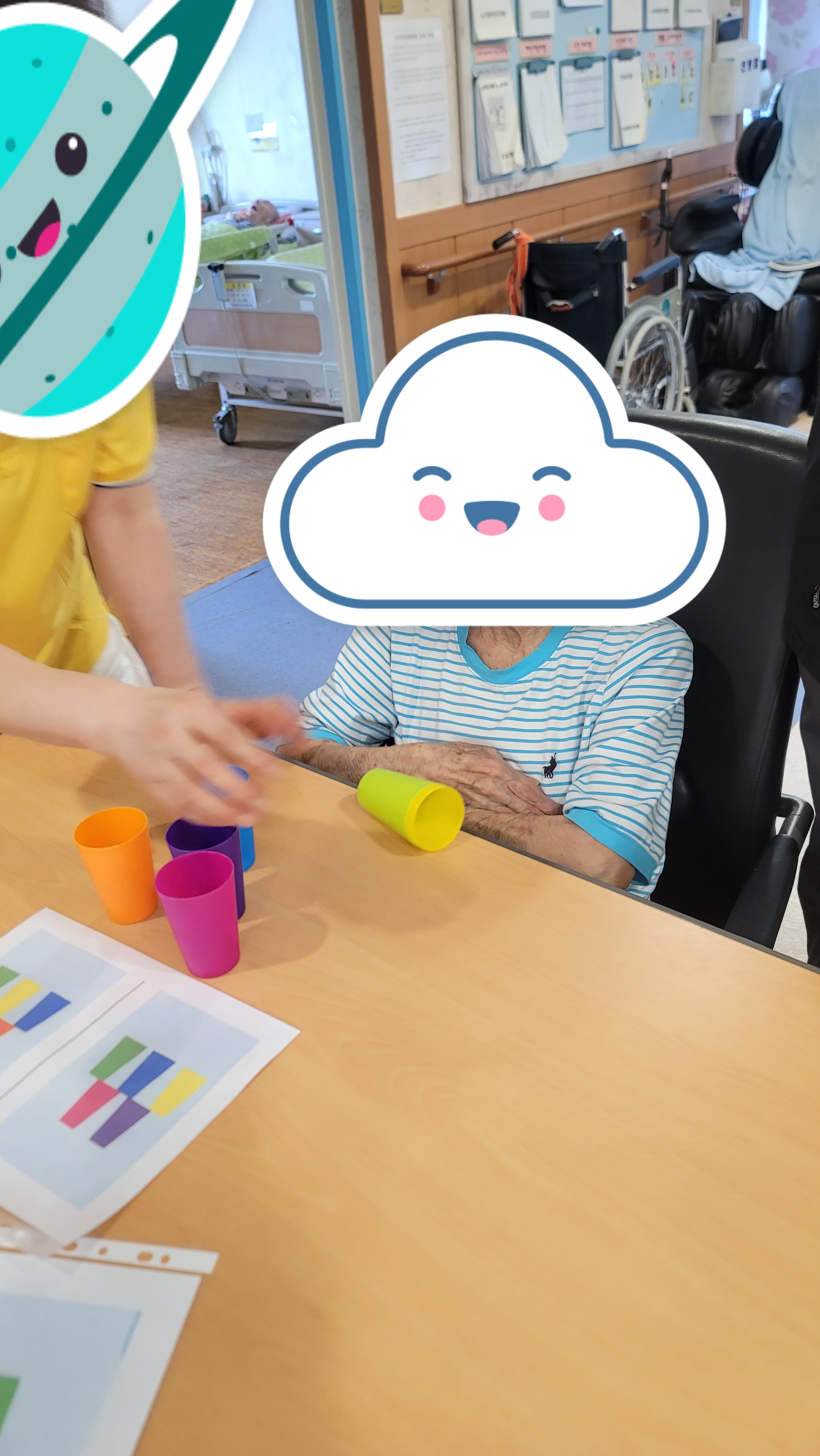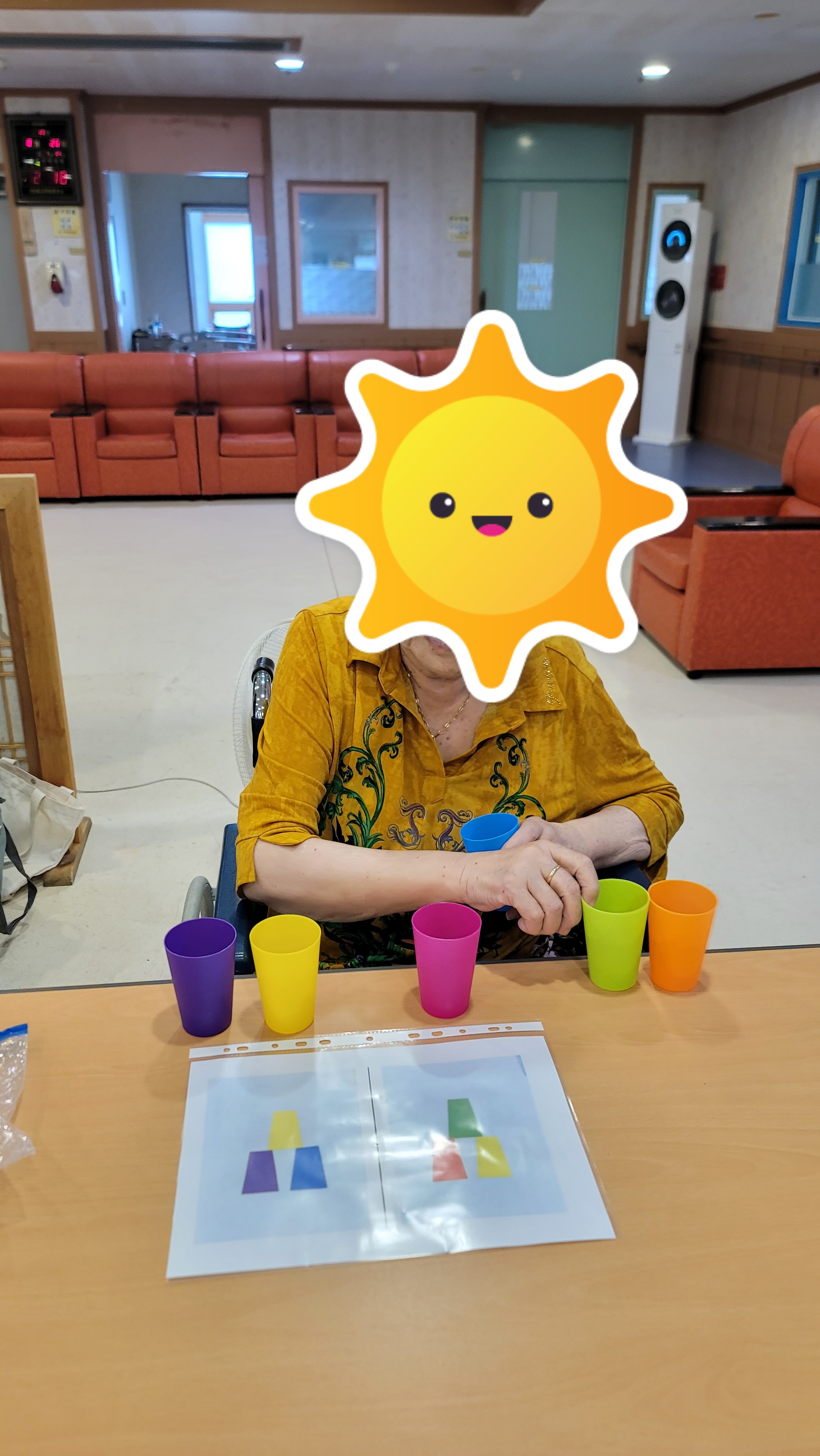 간단한 시니어 스트레칭과 건강박수로 활기를 북돋은 다음, 형형색색의 플라스틱 컵을 이용해 컵쌓기 프로그램을 해보았습니다. 다양한 색의 컵을 활동지에 나와있는 모양 그대로 하나 하나 쌓아서 모양을 완성해보니 아무 도움 없이 스스로 해냈다는 큰 기쁨에 시간 가는 줄 몰랐습니다.