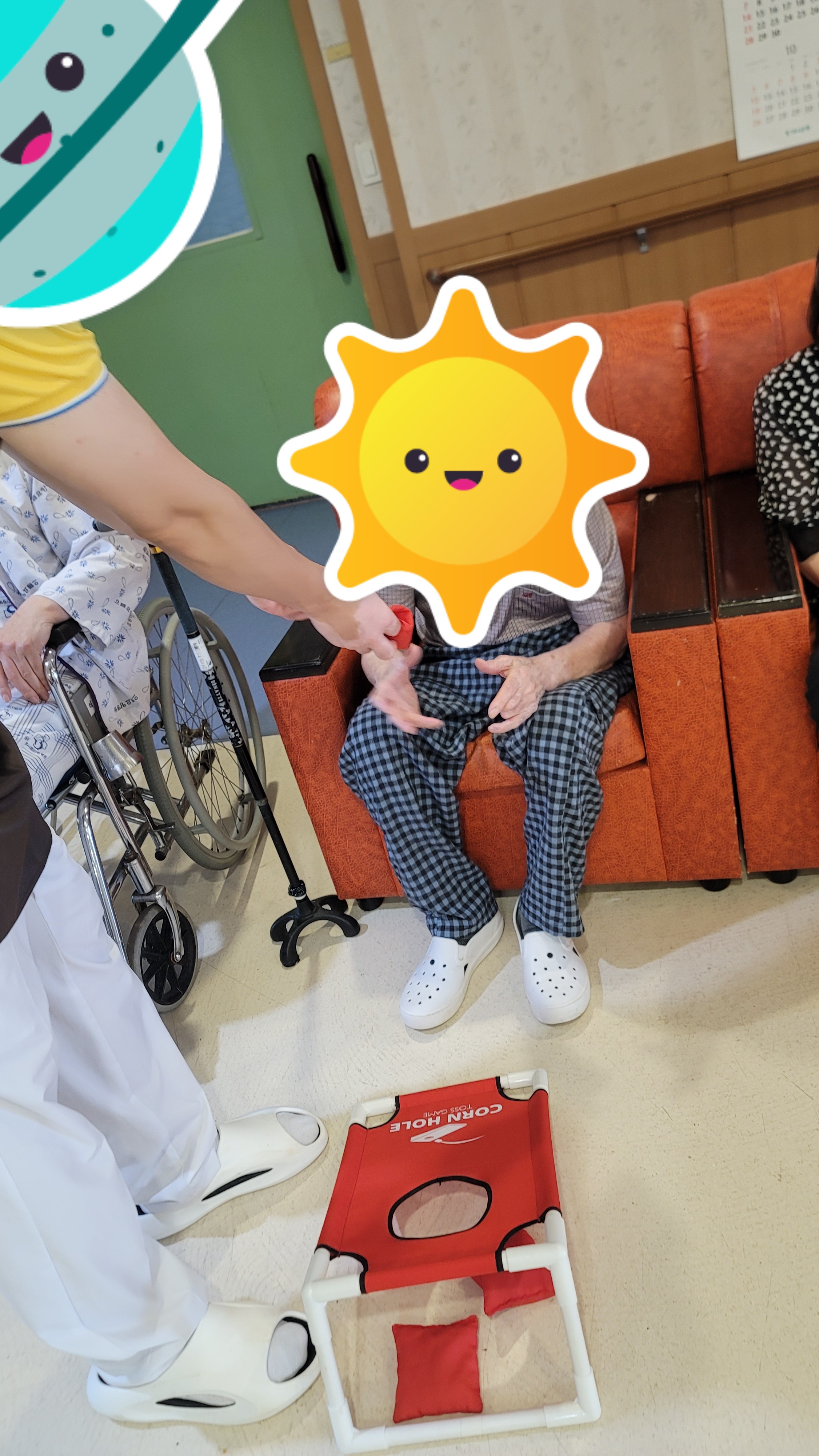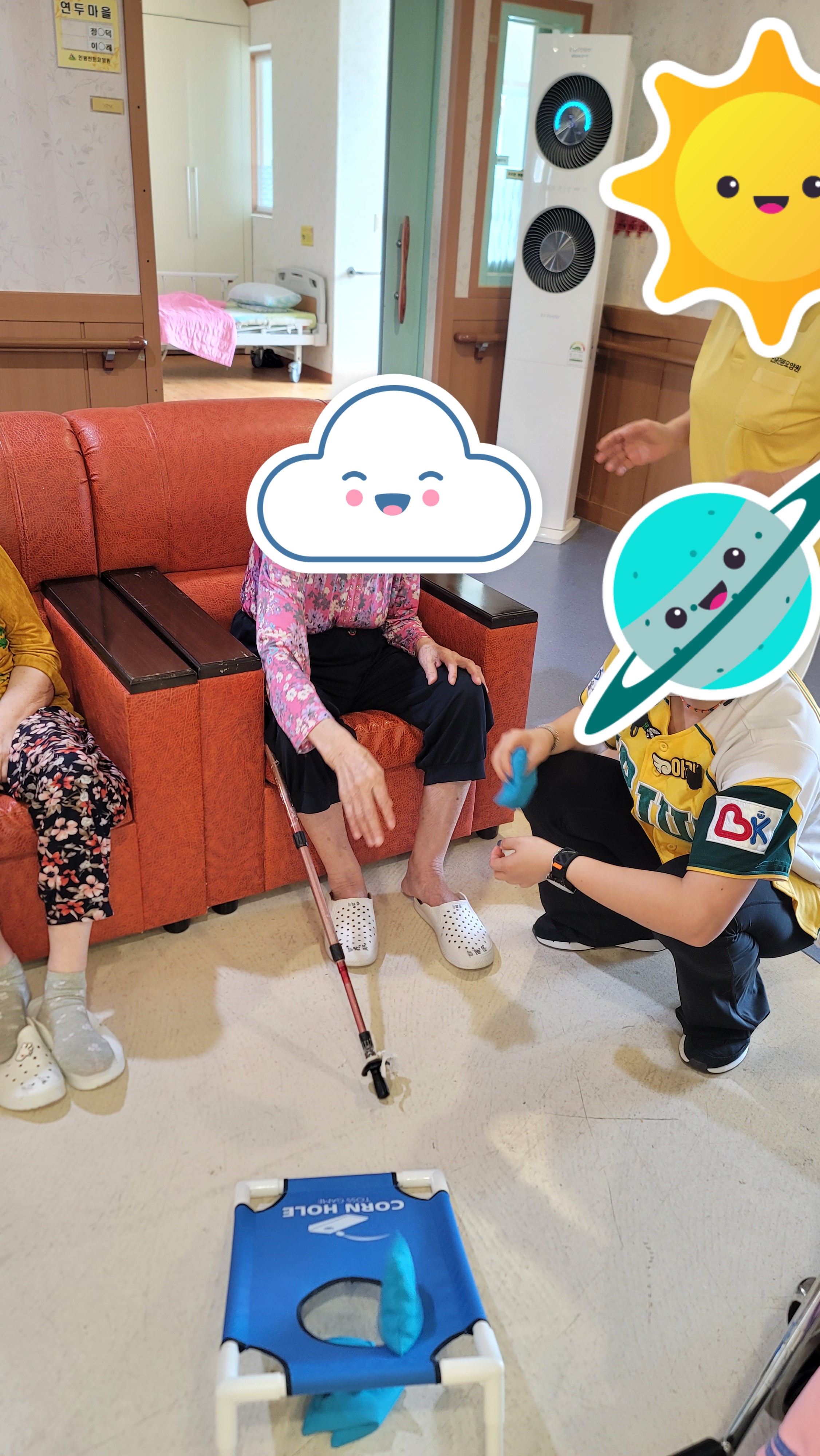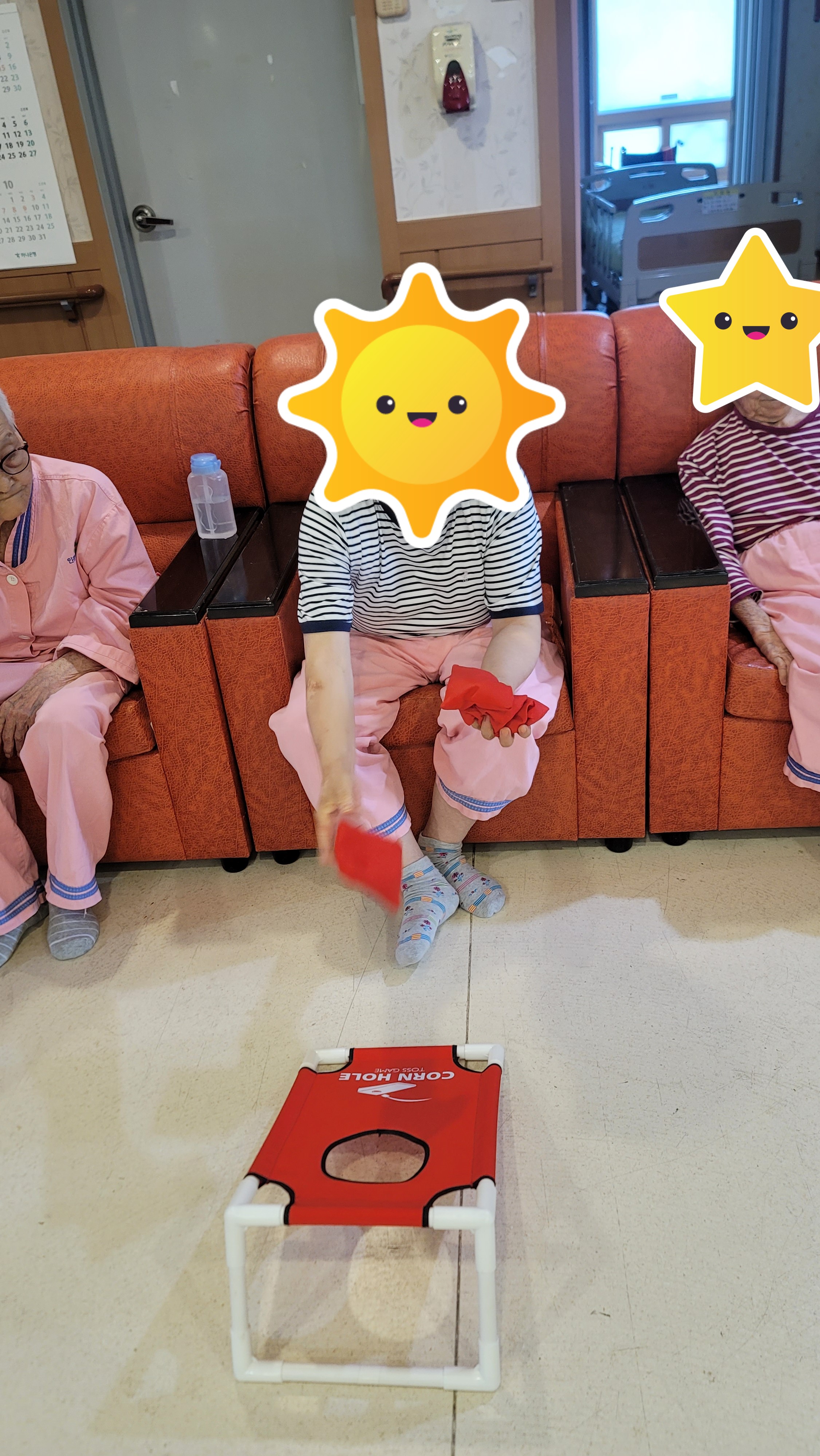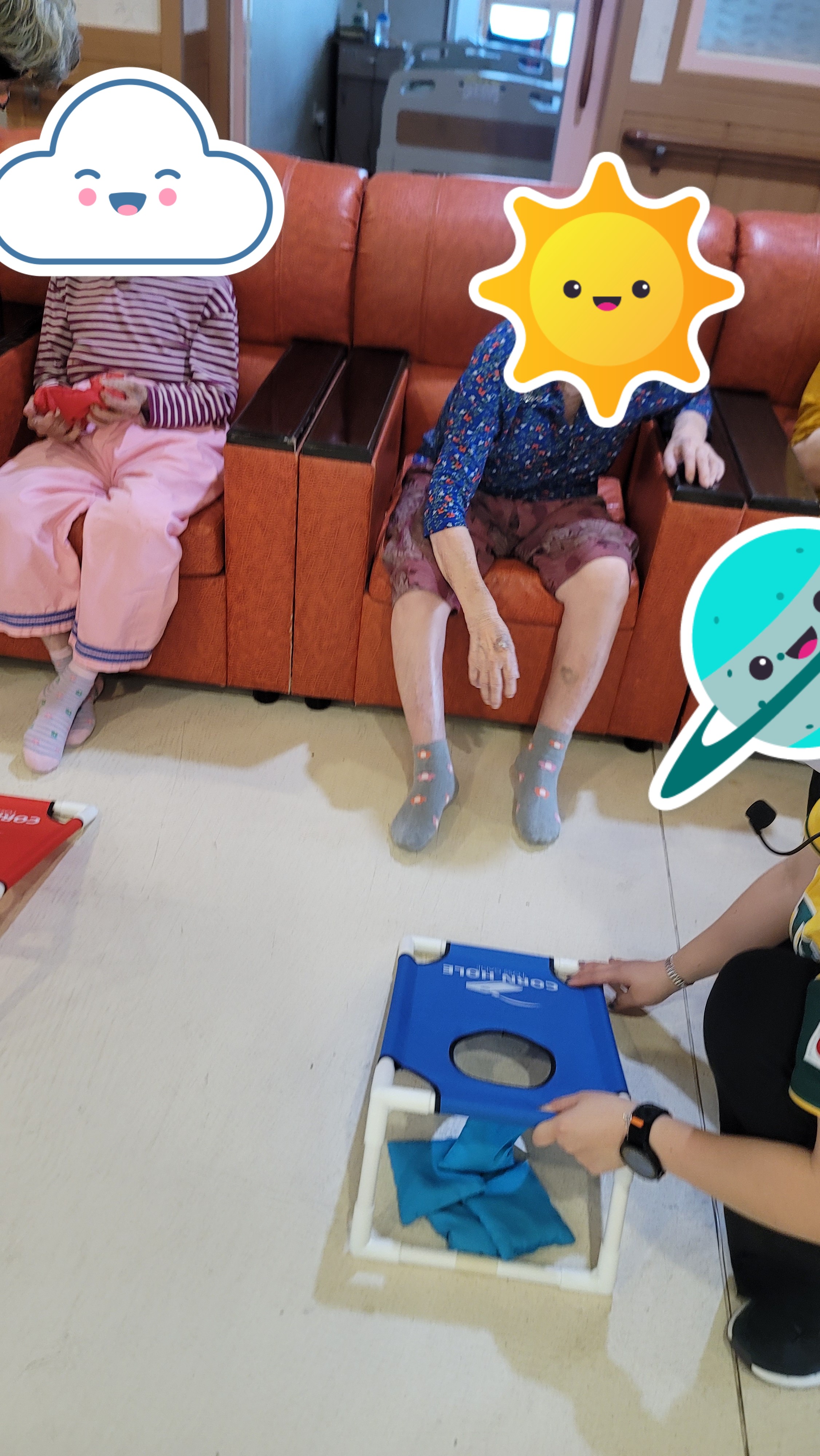 장소 : 요양원 2층 프로그램실 ★ 인원 : 어르신 22명 참석 ★ 내용 : 신체 활동 프로그램 활동 맞춤형 프로그램 강사님이 오셔서 어르신들과 함께 신체 활동프로그램을 진행하였습니다. 간단한 시니어 스트레칭과 탄력밴드 체조로 활기를 북돋은 다음, 콘 홀을 이용하여 미니 골프를 해보았습니다. 손으로 공을 던져 원형 가운데에 골인 시키는 게임이니 어르신들 모두 어려워 하지 않고 다들 쉽게 게임 방법을 이해하고 게임을 즐기셨습니다.
